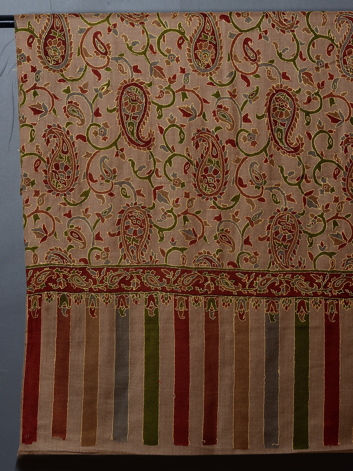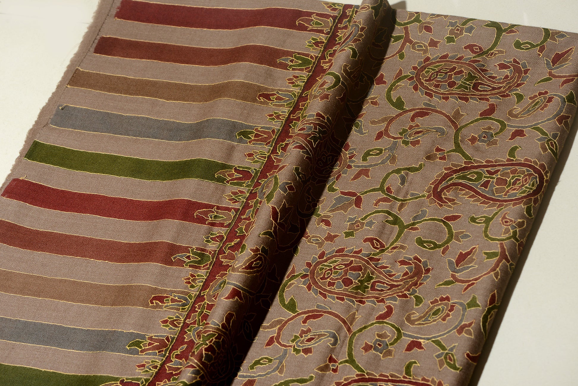 The traditional name for this variety of shawls is" Kani" and is very famous from the lands of Kashmir. Kani is generally an array of beautiful patterns woven using bright colors with a multi colored striped edges. This particular shawl is made in wool, but is not hand woven. It is machine woven to give the Kani look. The original Kani is much more lighter, softer to feel and more luxurious.