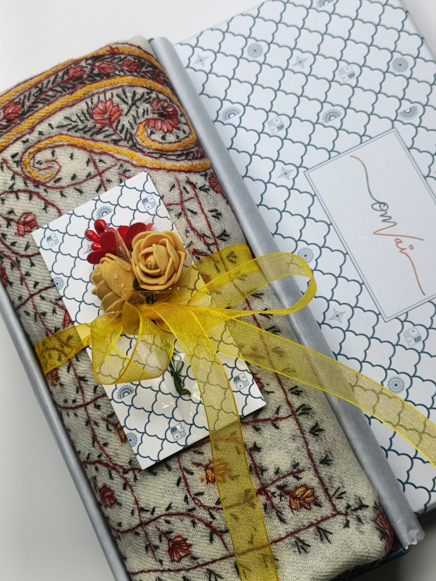 Crafted by the artisans of Kashmir, it has a soft hand feel and smooth texture. The Shawl embraces your silhouette with elegance and poise. Easy to drape and wrap around for the cozy warm feel. Experience the Luxury of drapes with OMVAI.