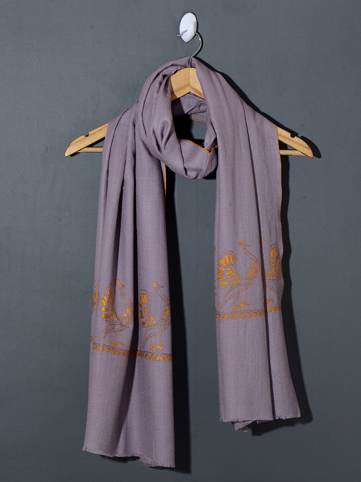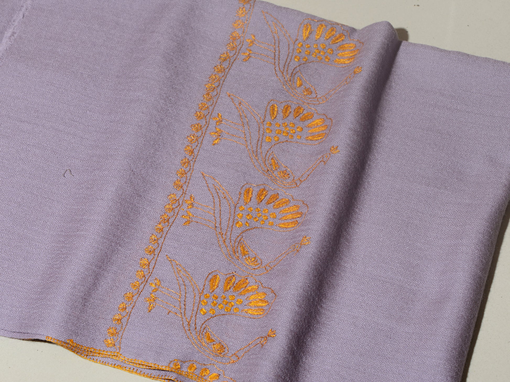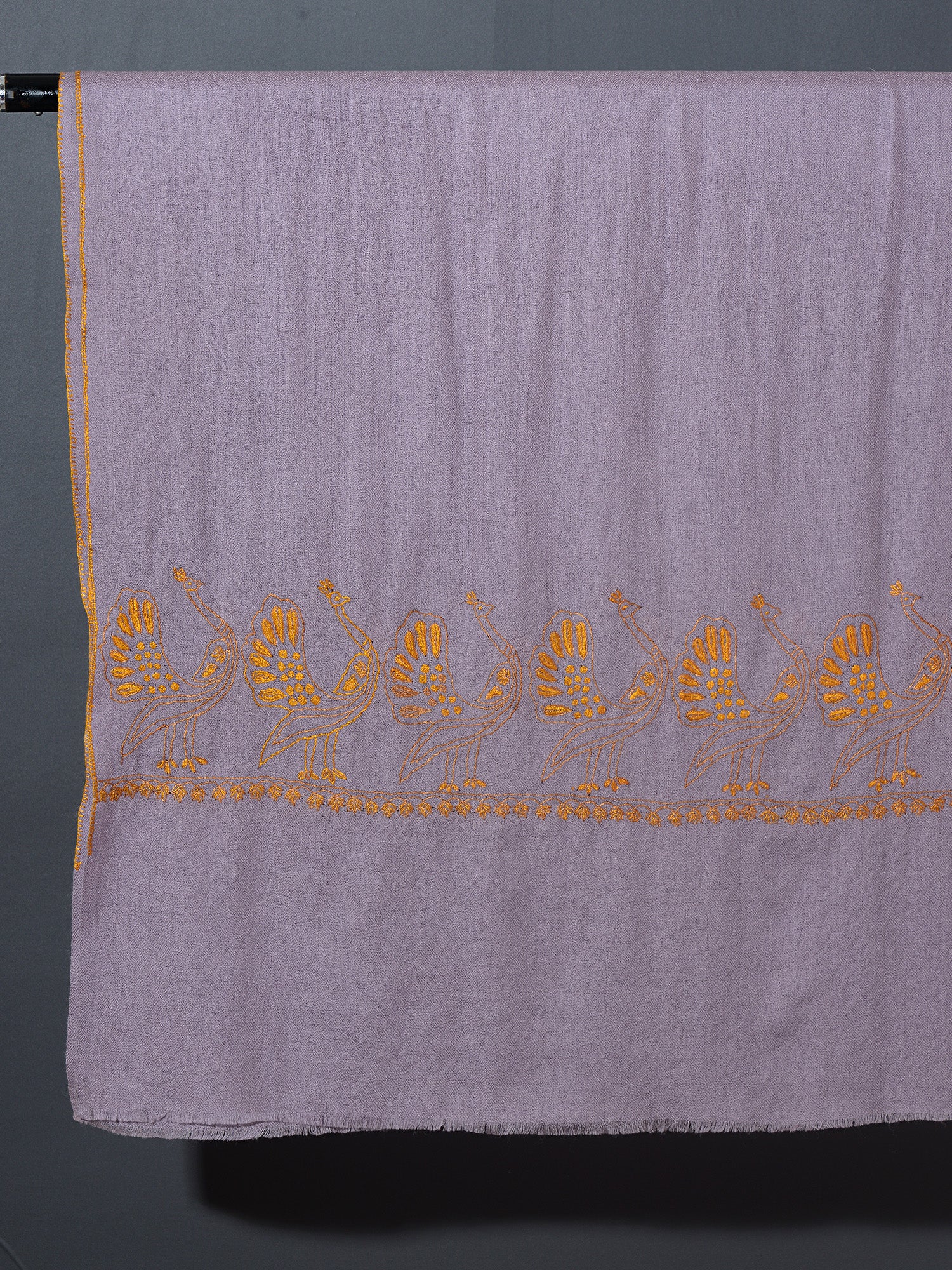 MAYURA, the Peacock Magnificent Hand Embroidered Stole - Lilac - Ochre
