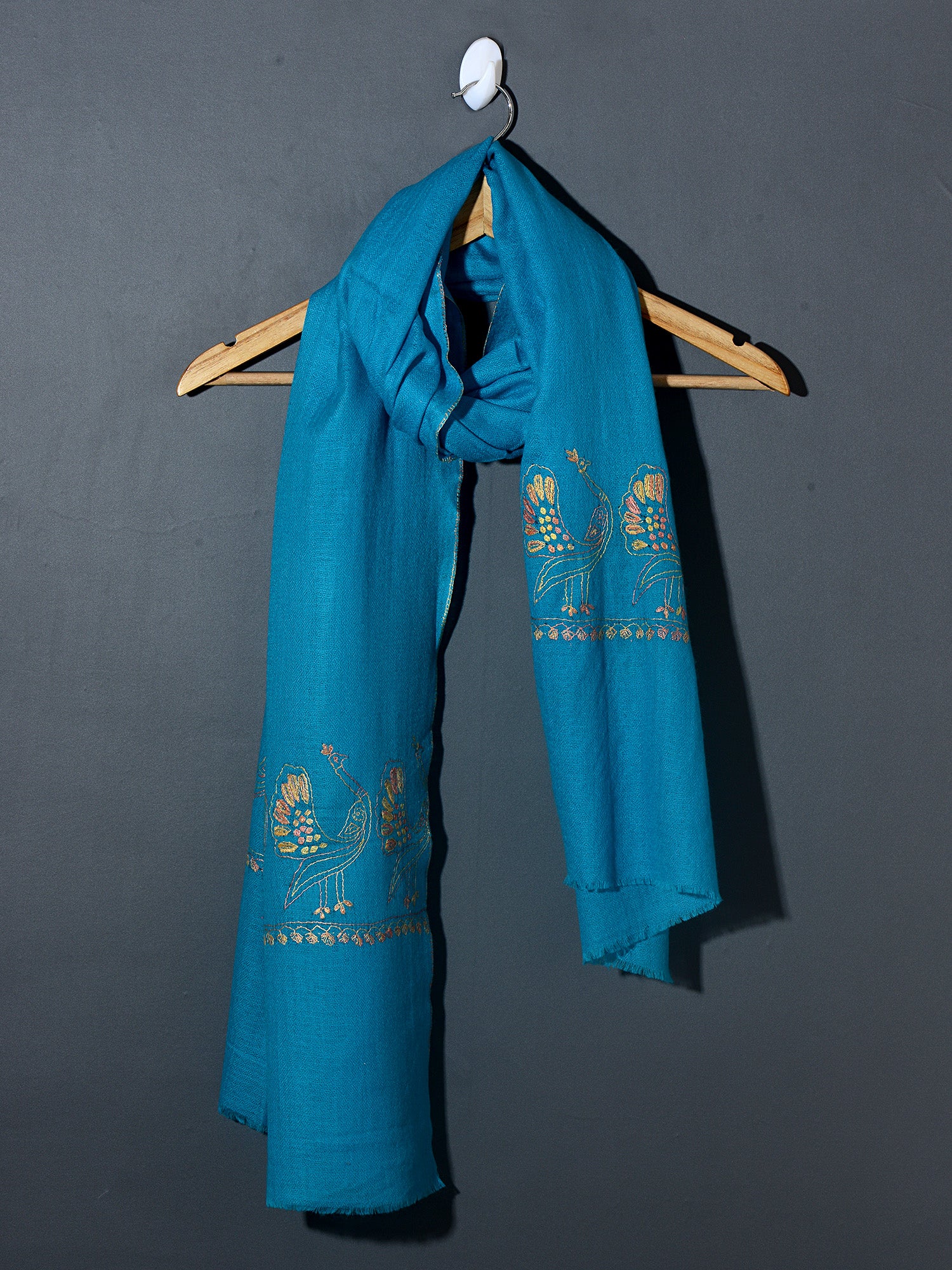 MAYURA, the Peacock Magnificent Hand Embroidered Stole - Ocean Blue