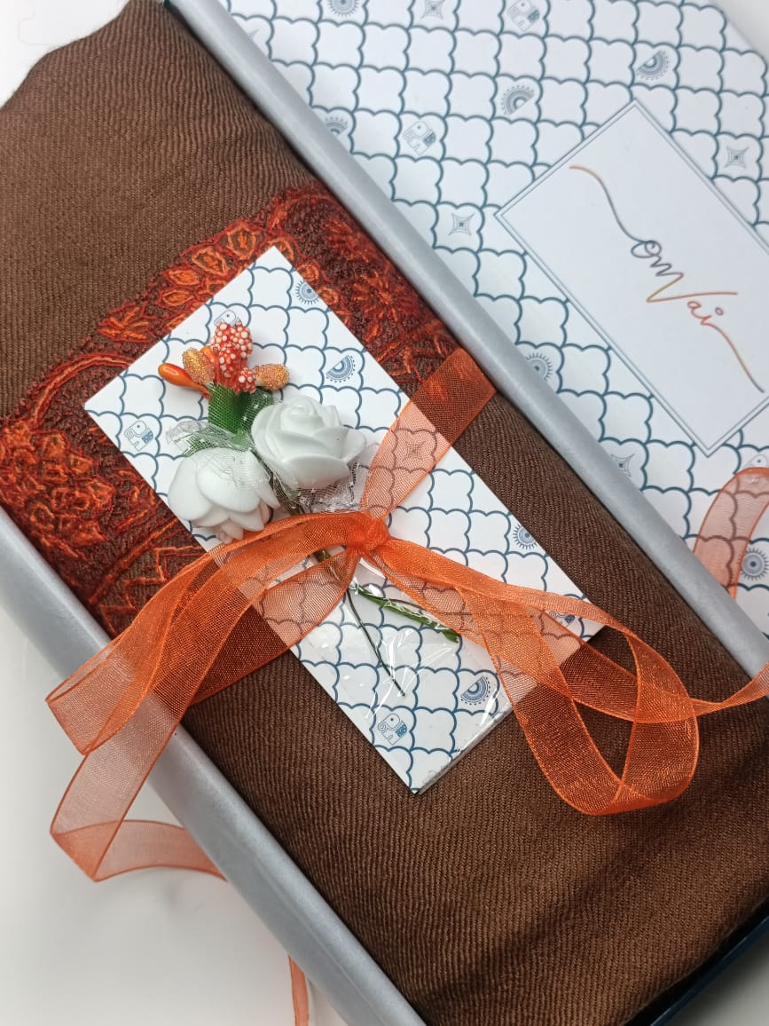 Naaz means pride and it is an elegant brown embroidered shawl, both for men and women, with a border in an intricate embroidery using silk threads. The embroidery done in bright orange and shades of autumn colors, sets the perfect rich and comfortable look.