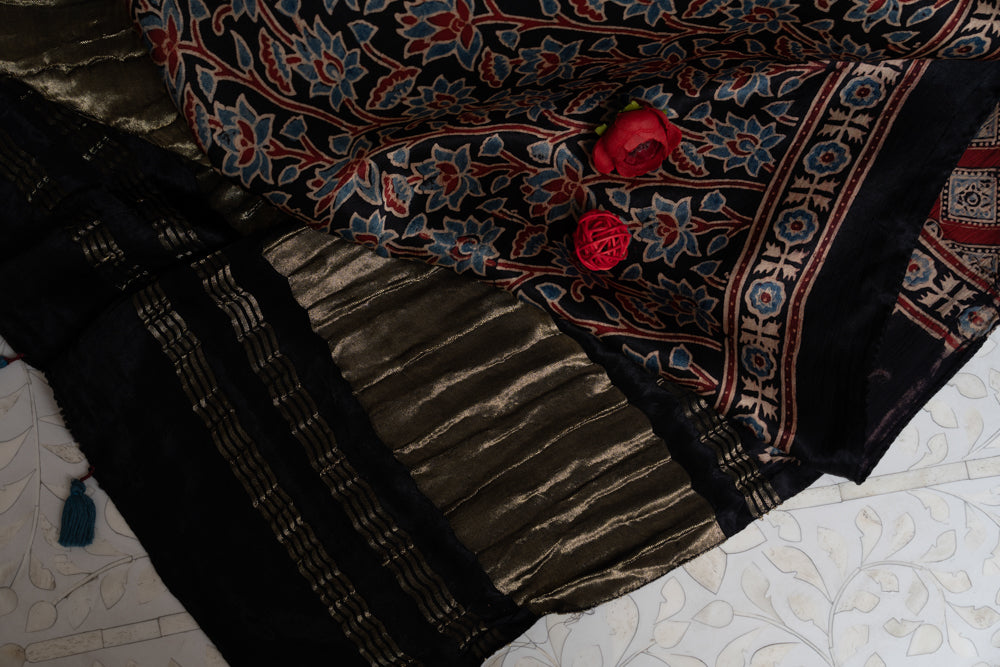 OMVAI Bel Sundari Hand Block Printed Premium Modal Stole with Zari Border - Black
