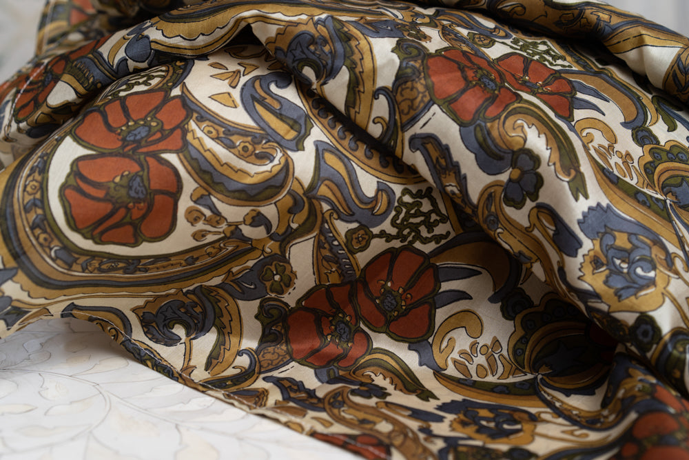 OMVAI's Bold and Beautiful Print Silk Scarf is inspired by the intricate details of the prints worn by Royal families and it helps you to stylize with a bold statement. This pretty silk scarf has a beautiful floral pattern in modern designs and color palette with a graceful tassels on four on all four sides. It is a elegant piece to brighten up your wardrobe.