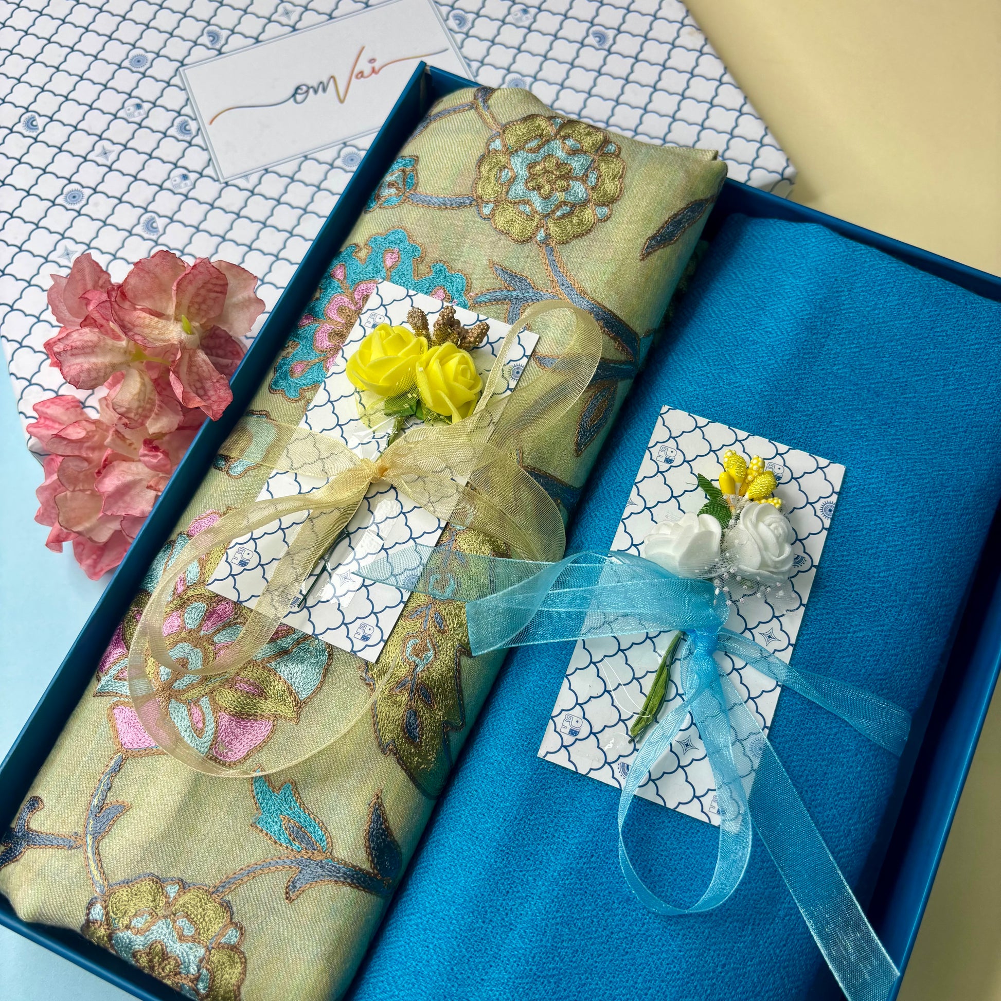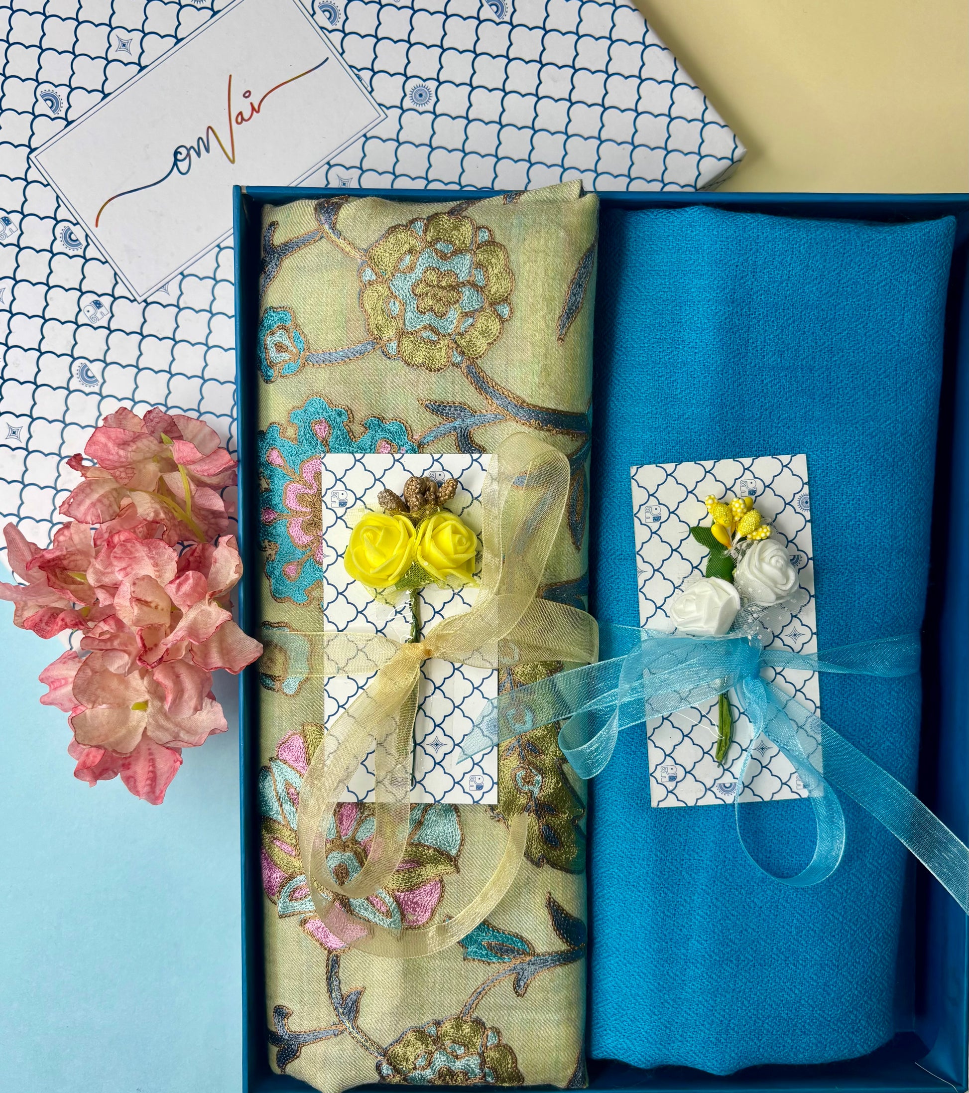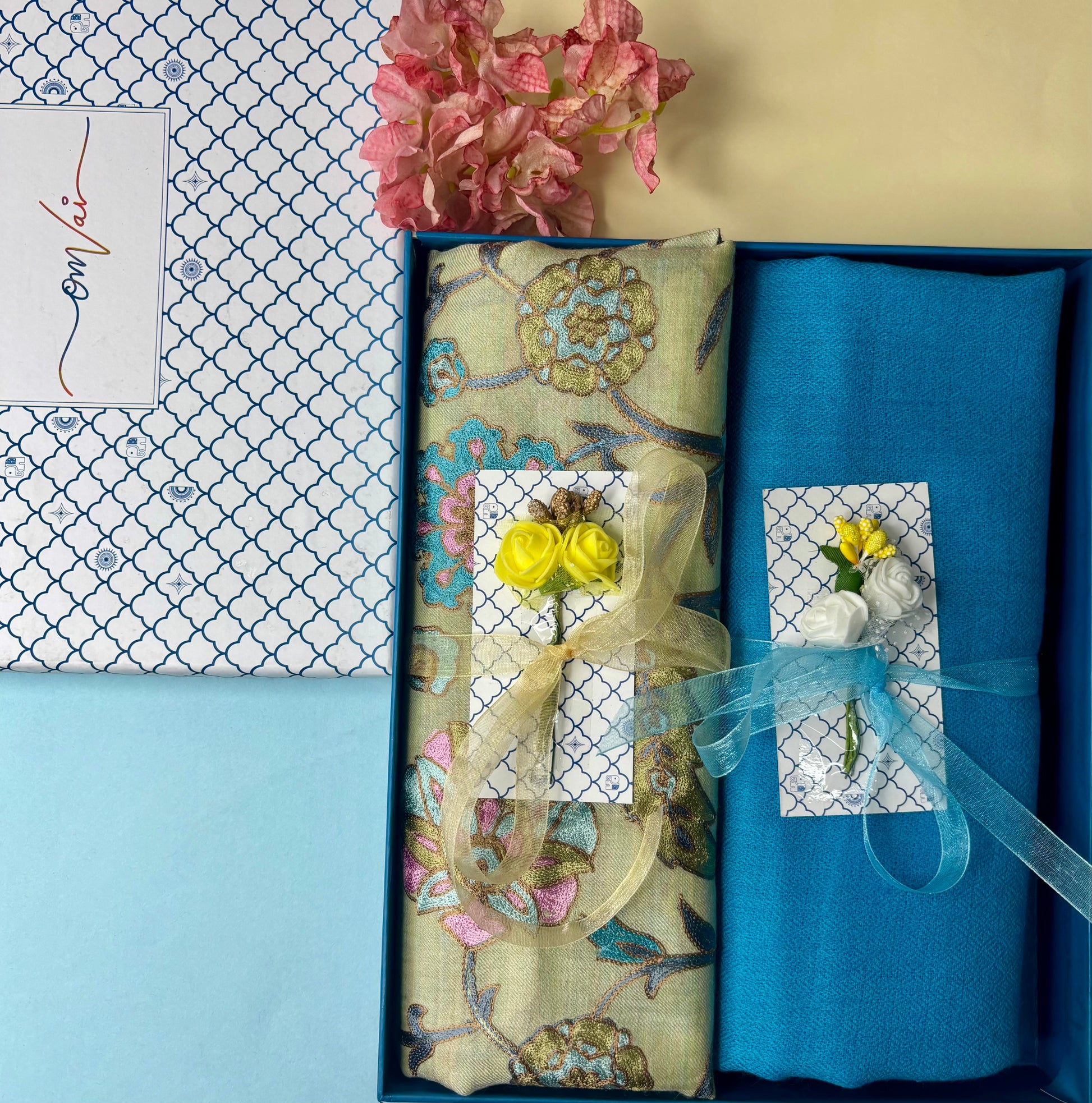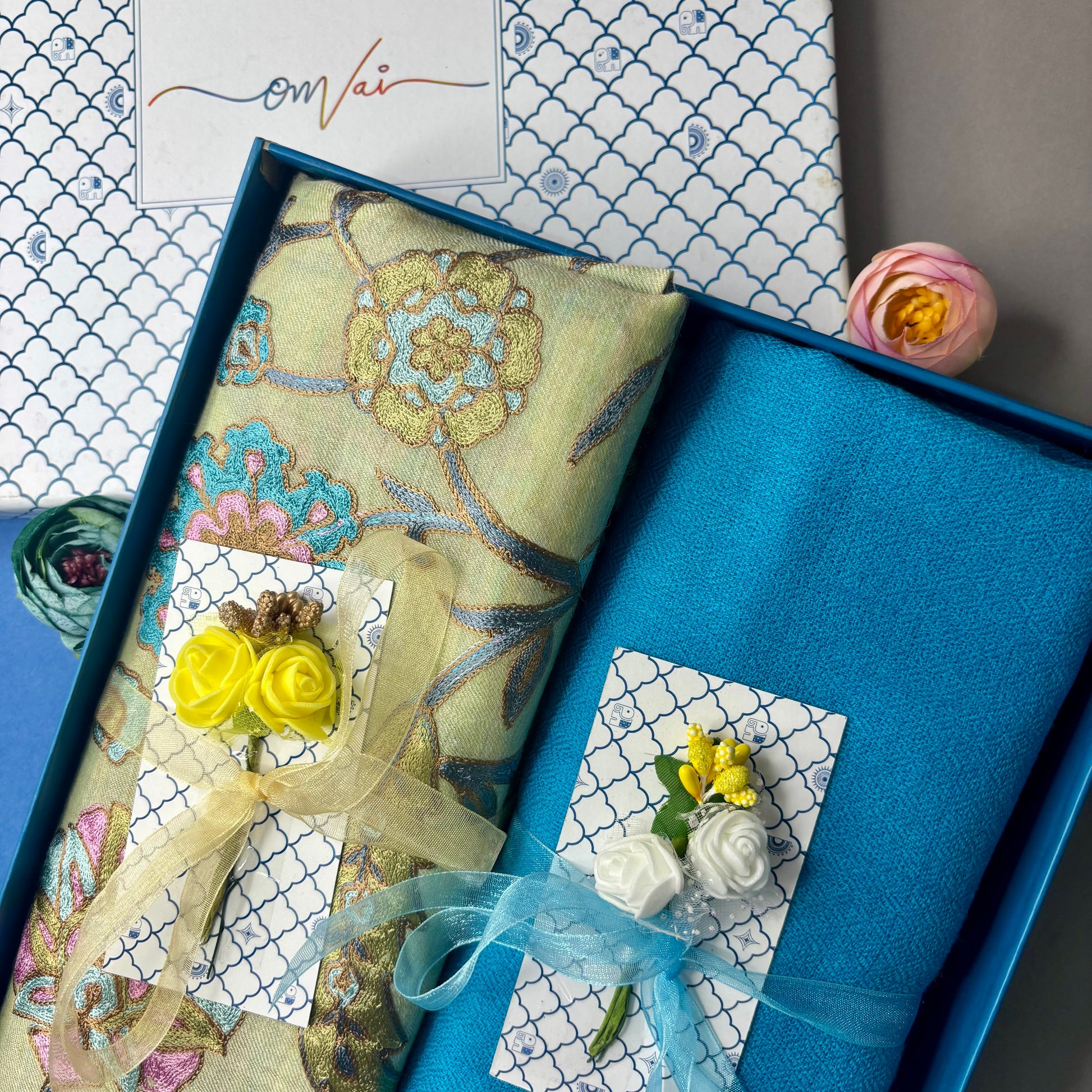 OMVAI Embroidery Pashmina Combo Gift Set in Pure Cashmere wool - Artichoke Embroidered Stole with Powder Blue Solid Stole (Set of 2 - For HIM and for HER)
