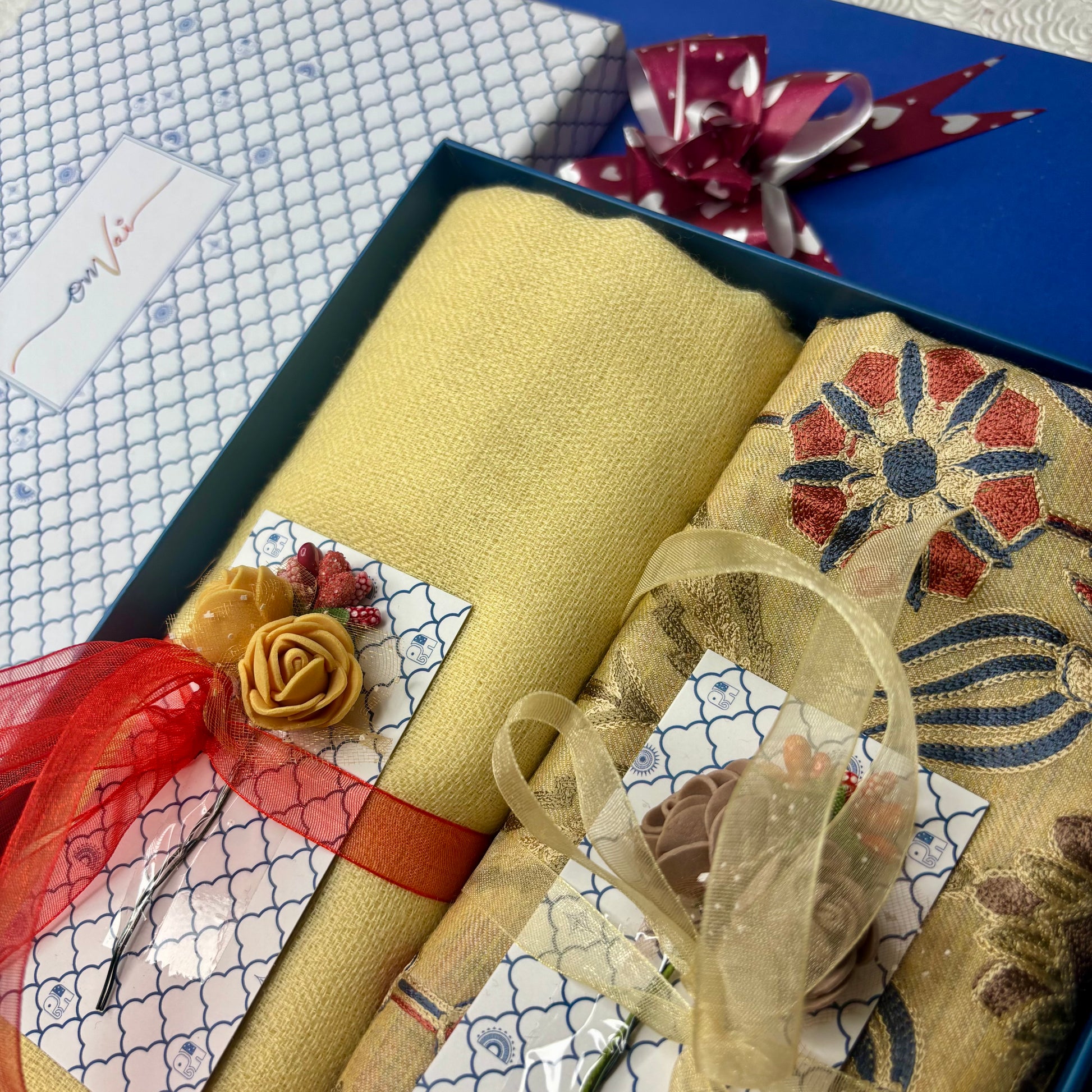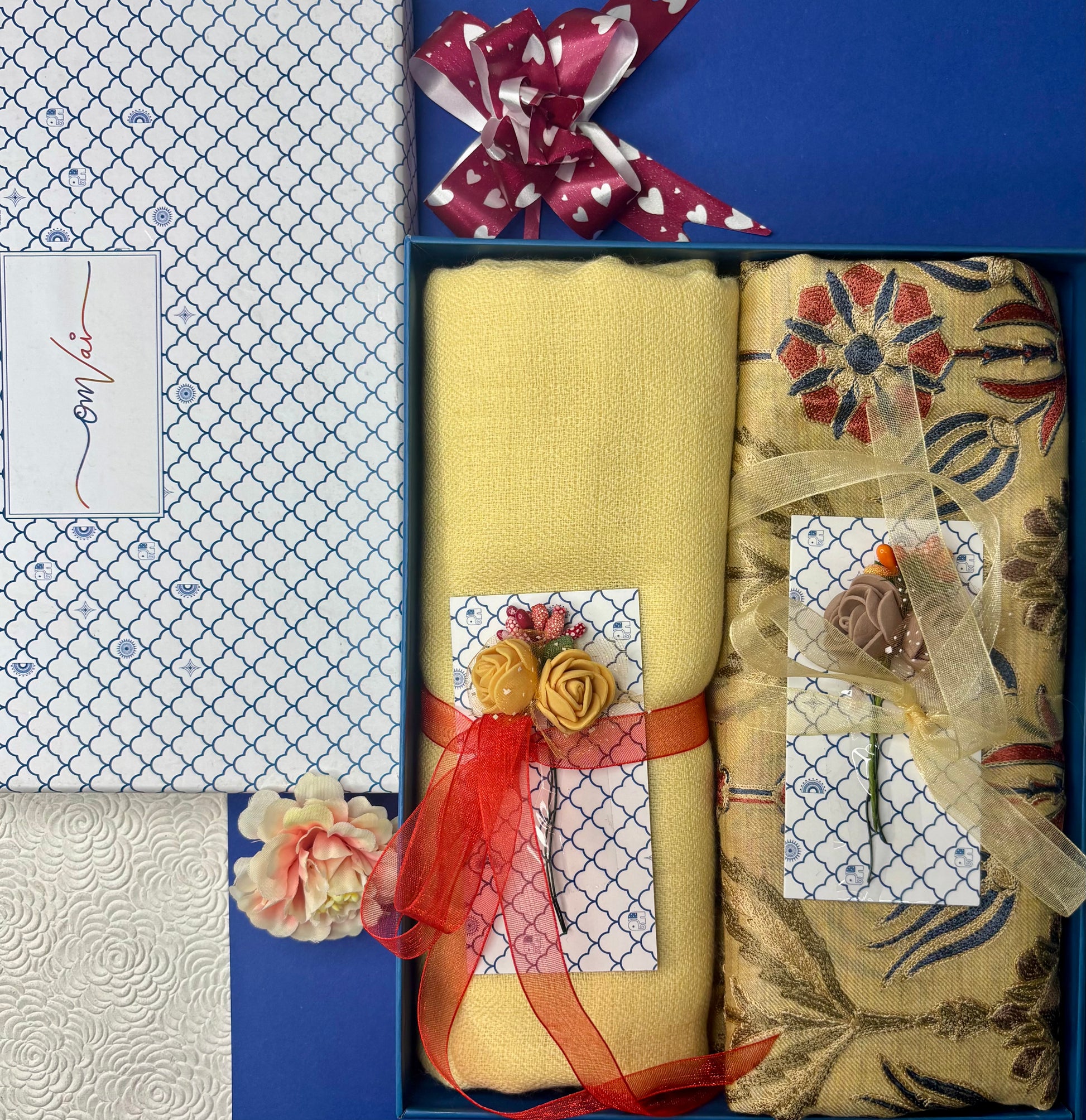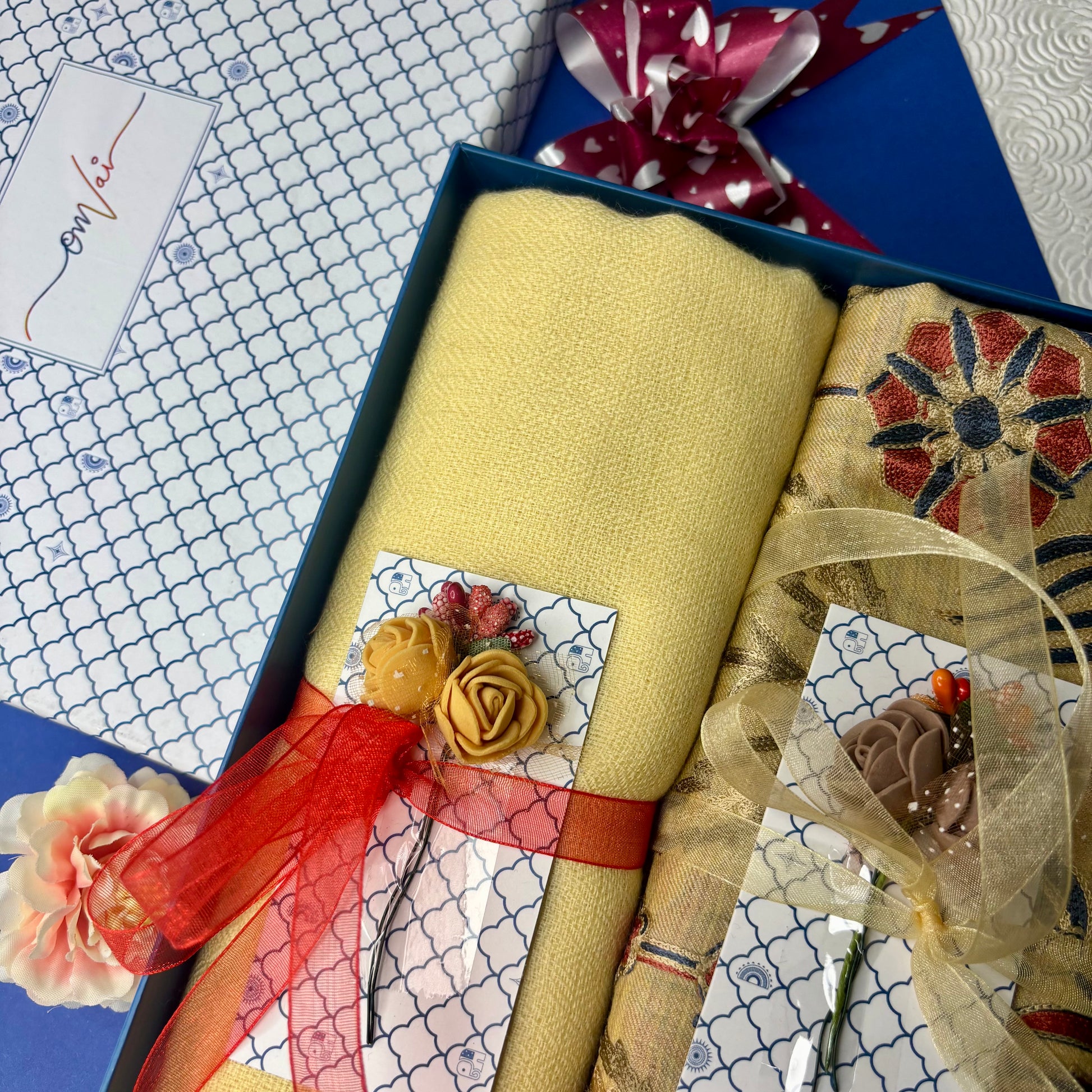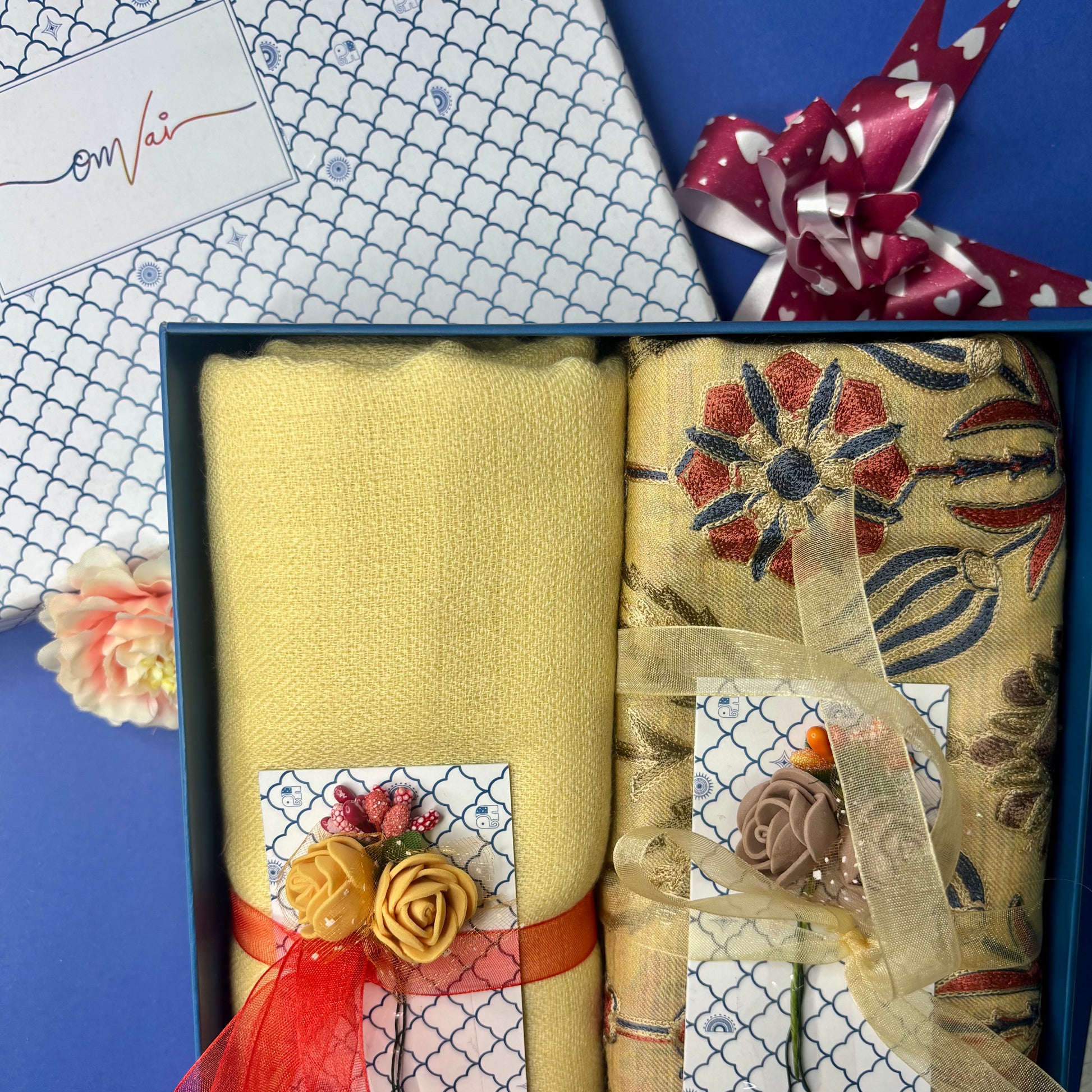 OMVAI Embroidery Pashmina Combo Gift Set in Pure Cashmere wool - Buttercup Yellow Embroidered Stole with Buttercup Yellow Solid Stole (Set of 2 - For HIM and for HER)