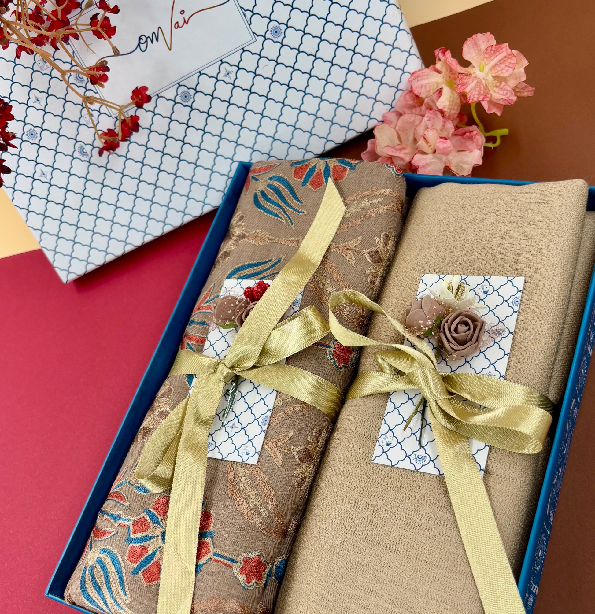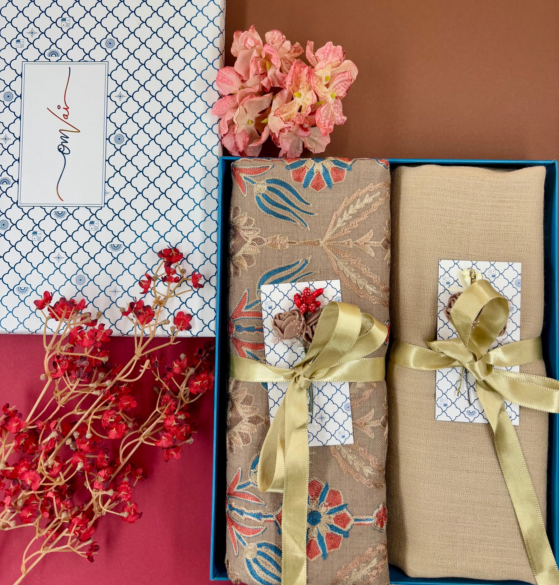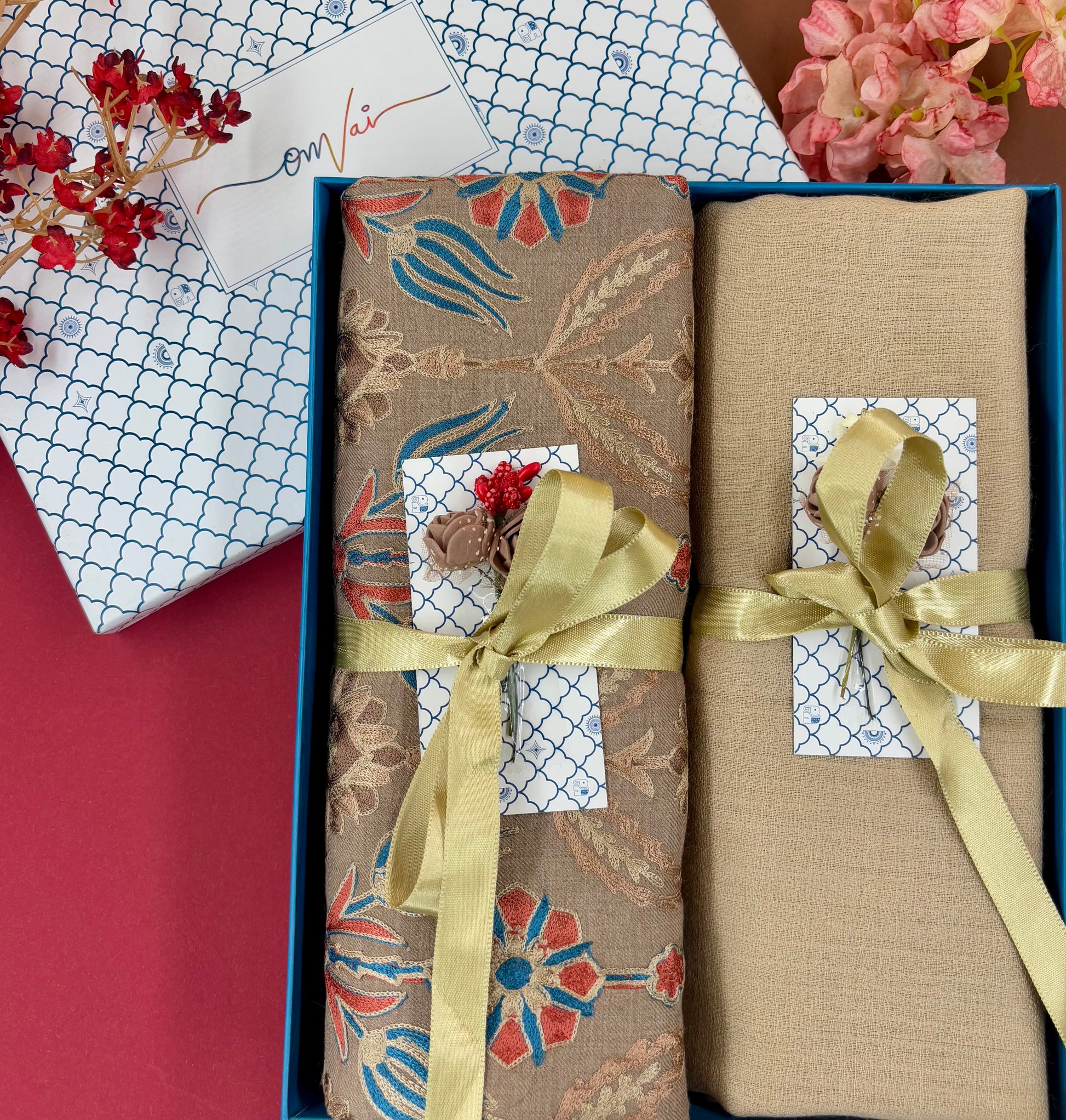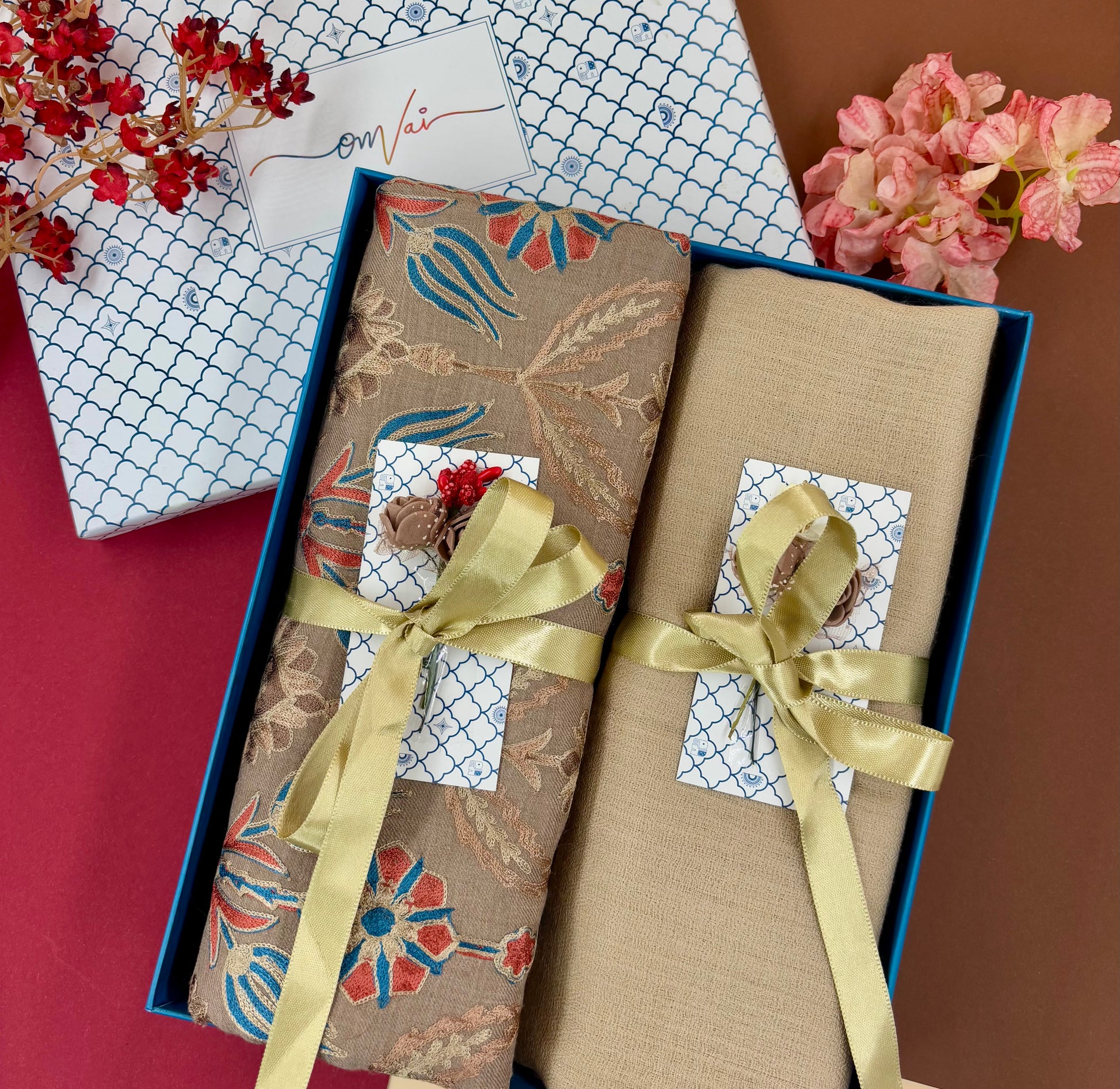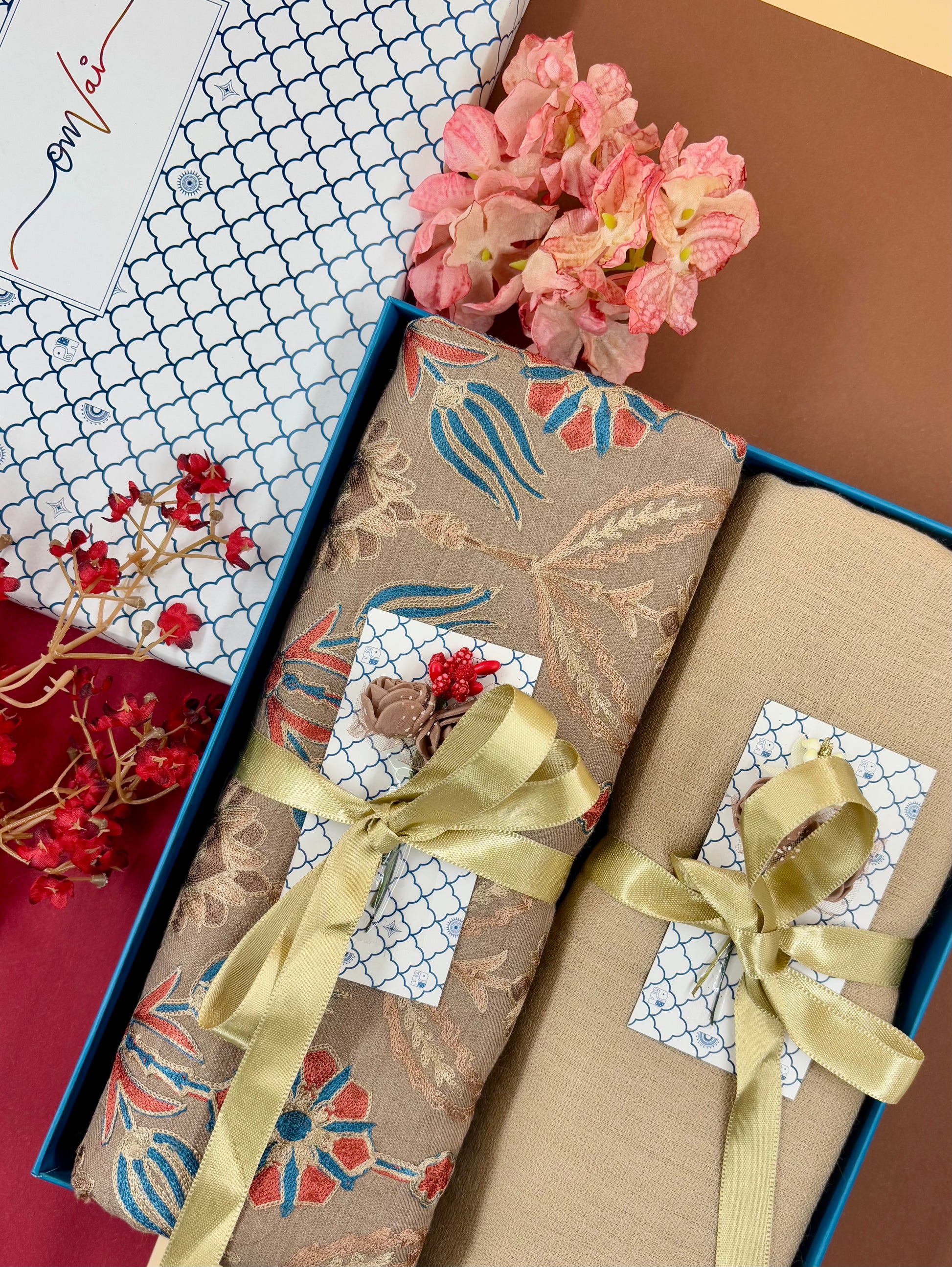 OMVAI Embroidery Pashmina Combo Gift Set in Pure Cashmere wool - Caramel Embroidered Stole with Beige Solid Stole (Set of 2 - For HIM and for HER)