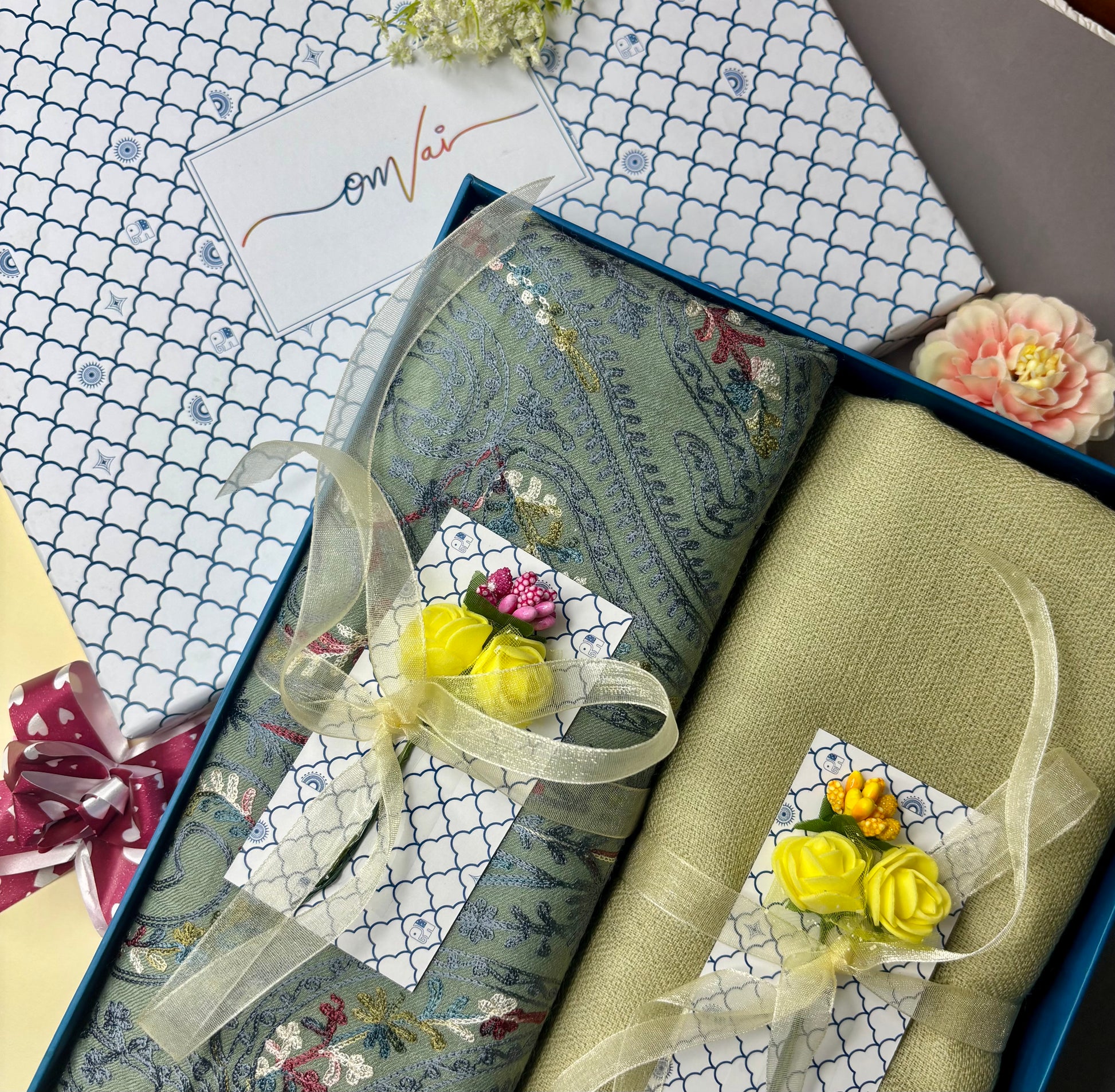 OMVAI Embroidery Pashmina Combo Gift Set in Pure Cashmere wool - Sage Embroidered Stole with Artichoke Solid Stole (Set of 2 - For HIM and for HER)