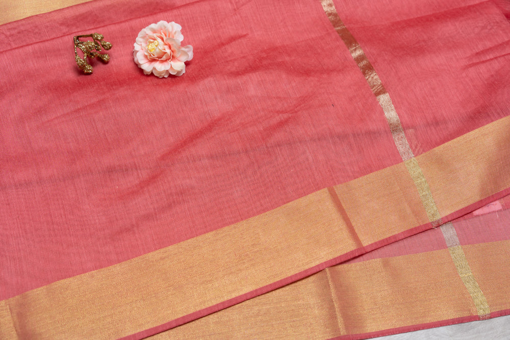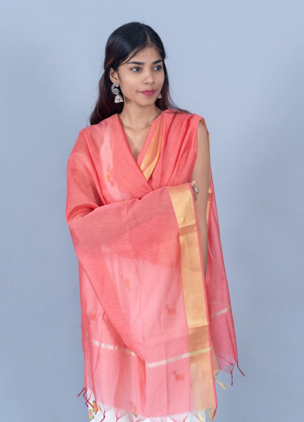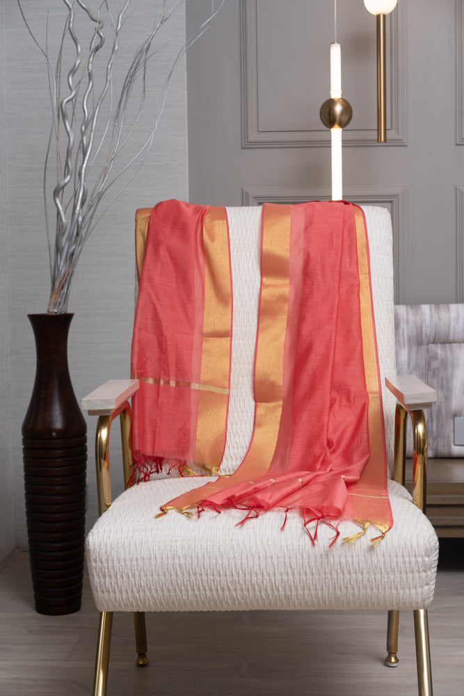 OMVAI Golden Border Chanderi Silk Dupatta - Coral