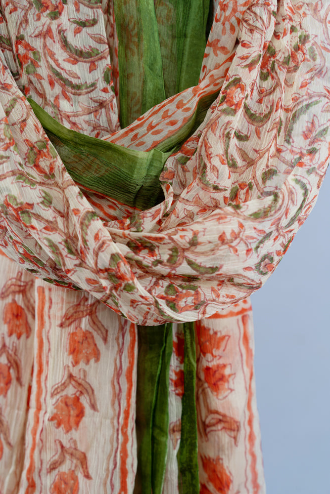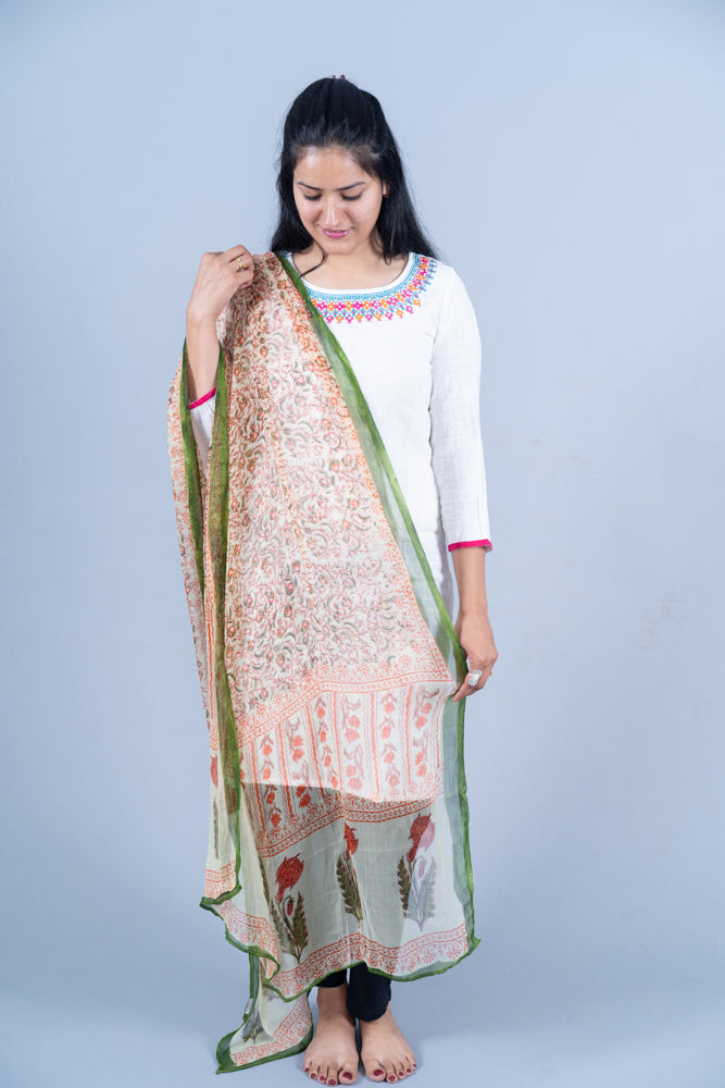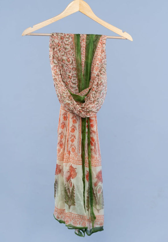 This floral chiffon dupatta is made with the finest quality and is hand block printed. With a beautiful green and multi colored bright floral print, it looks beautiful on your shoulders while you go out. The dupatta can be worn with jeans, a suit or a casual outfit. With this kind of quality and design, you will have a good time at any occasion.