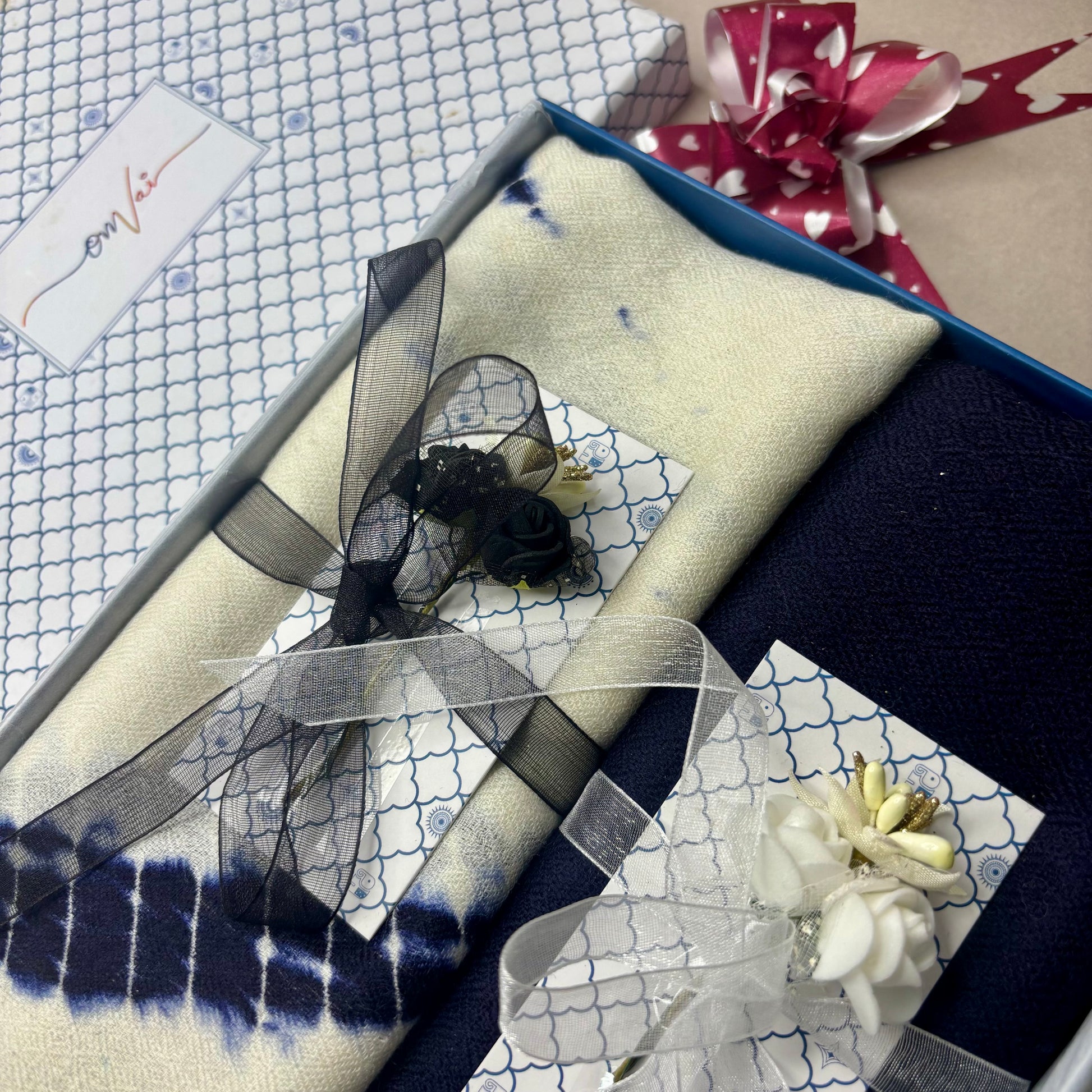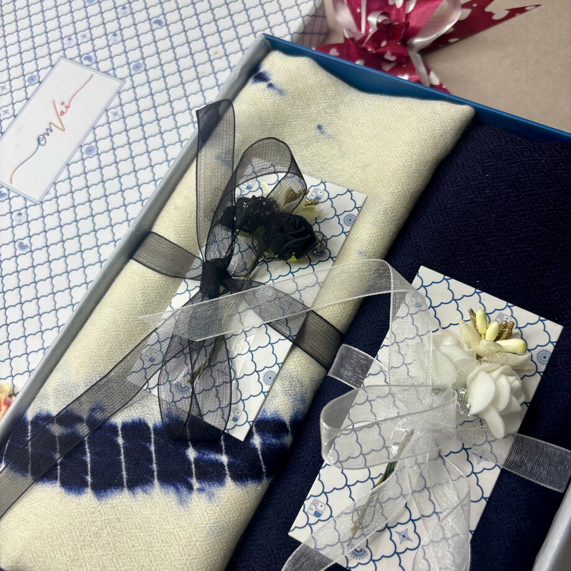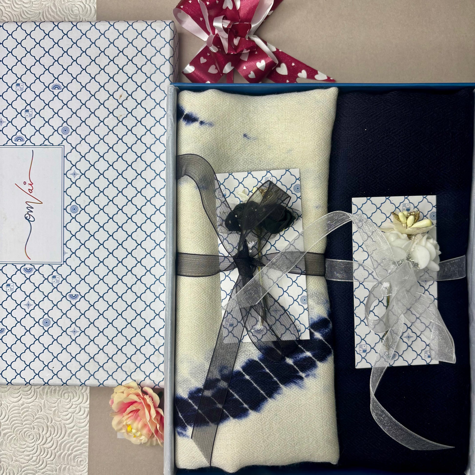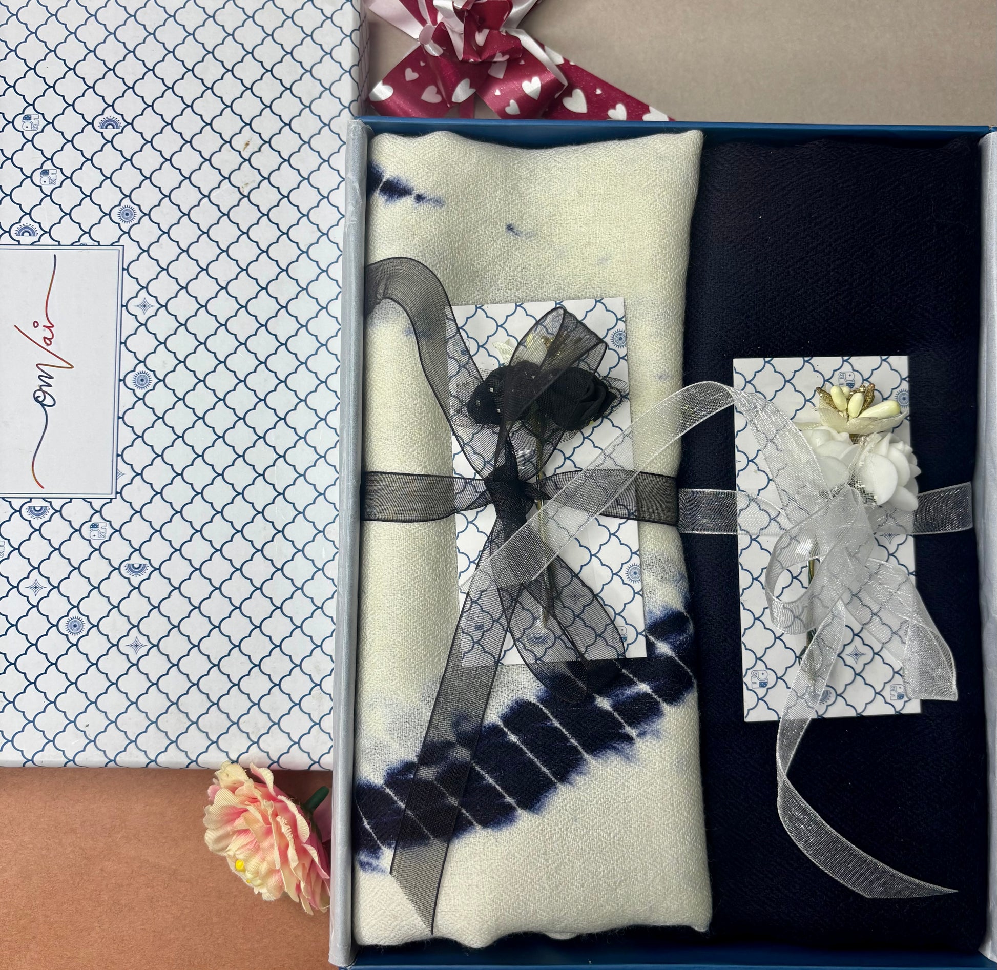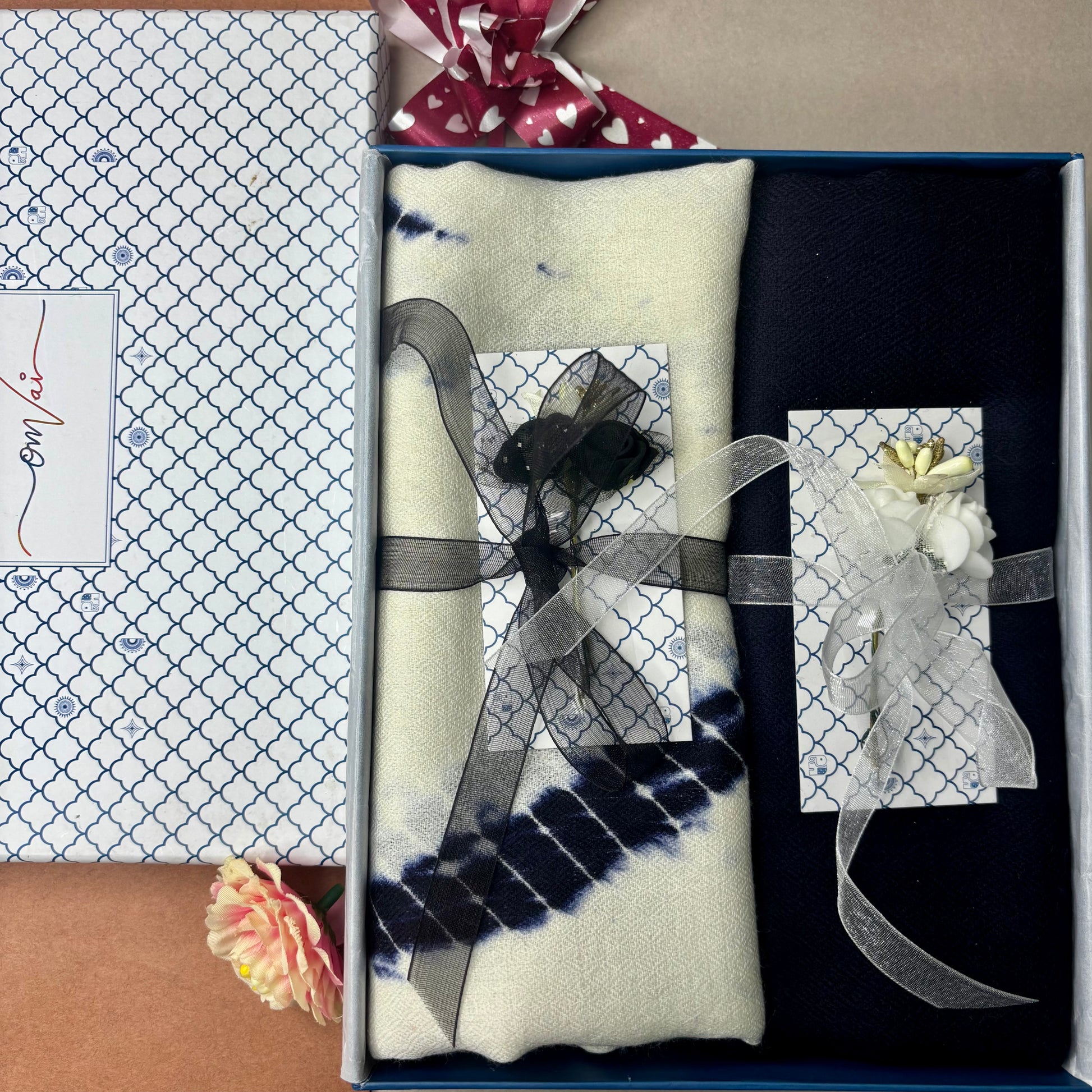 OMVAI Hand Block Tie Dye stole Combo Gift Set in Pure Cashmere wool with Blue Solid Stole (Set of 2 - For HIM and for HER)