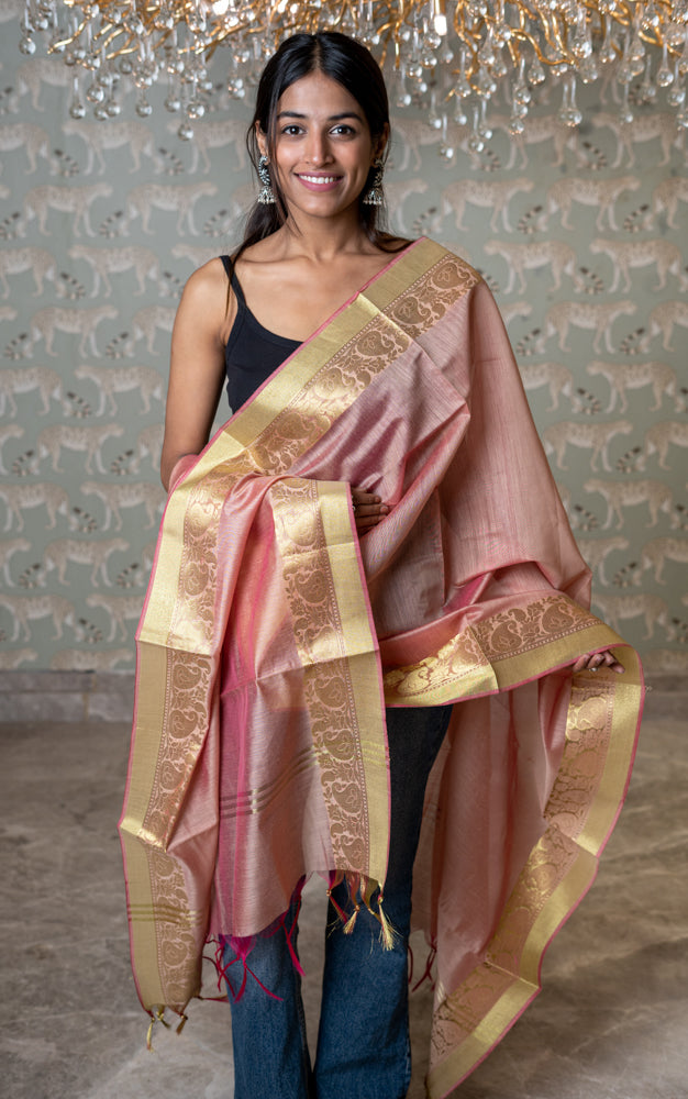 OMVAI Paisley Border Chanderi Silk Dupatta - Coral Blush
