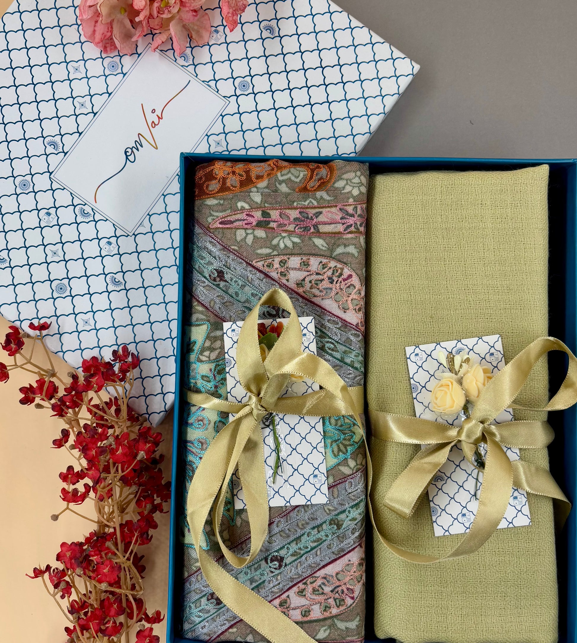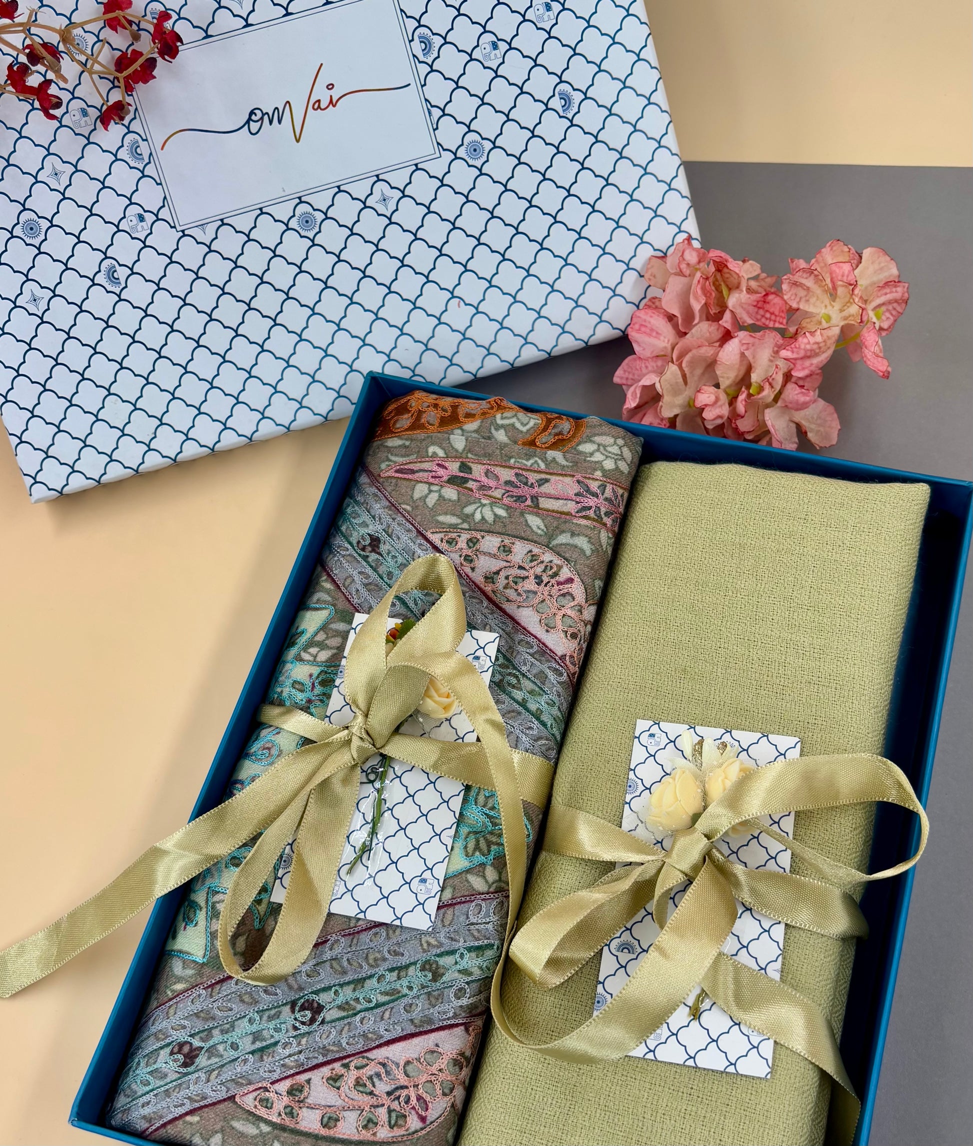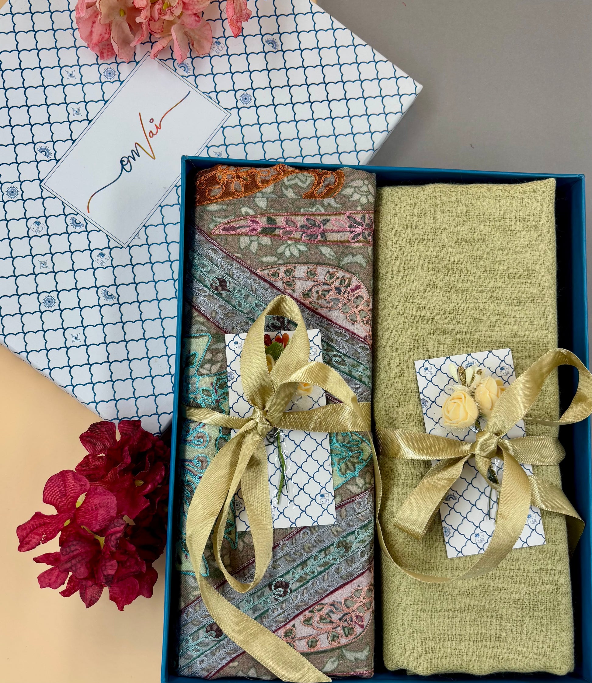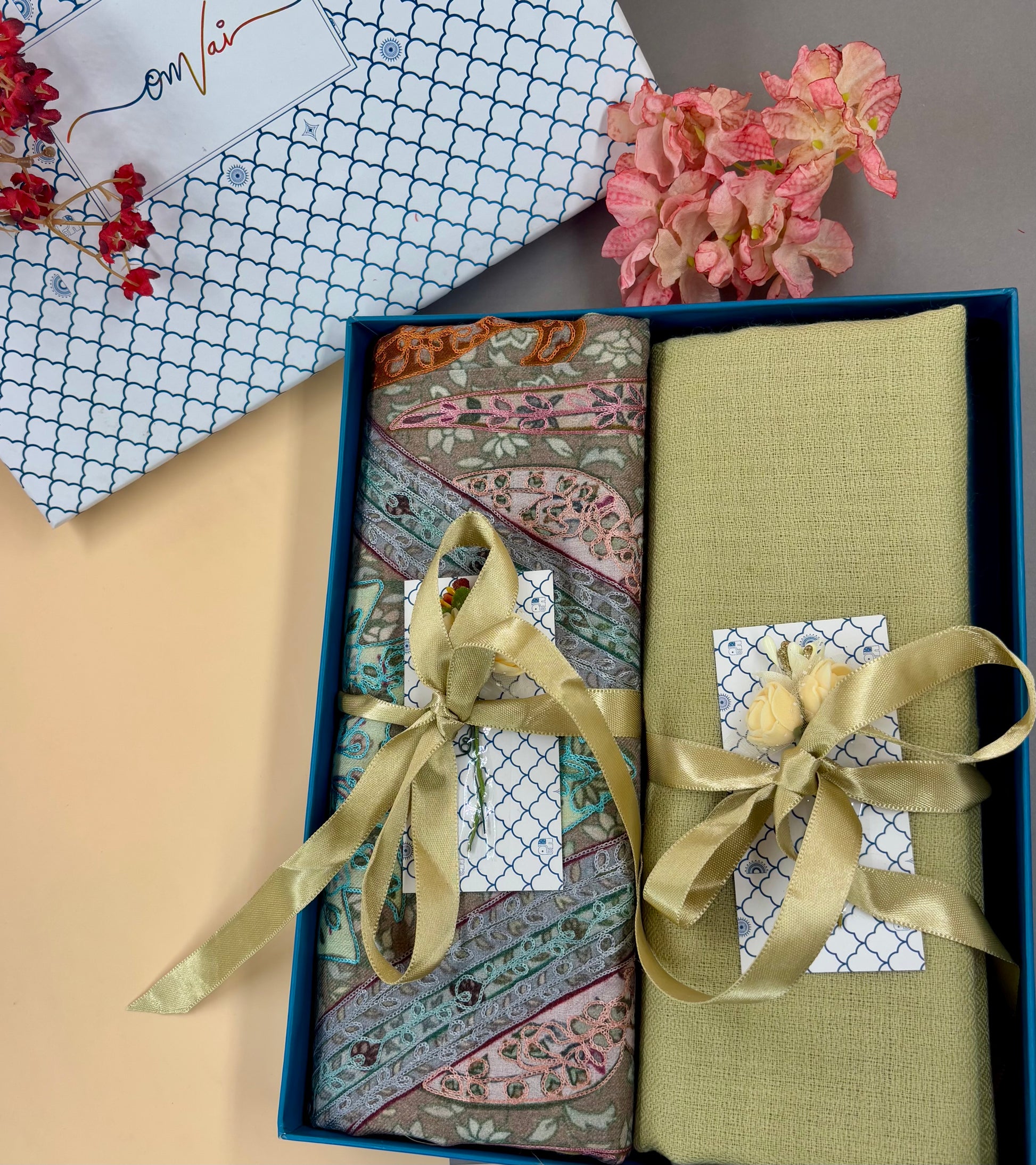OMVAI Pashmina Combo Gift Set in Pure Cashmere wool - Artichoke Kalamkari Kani with Embroidery and solid (Set of 2 - For HIM and for HER)