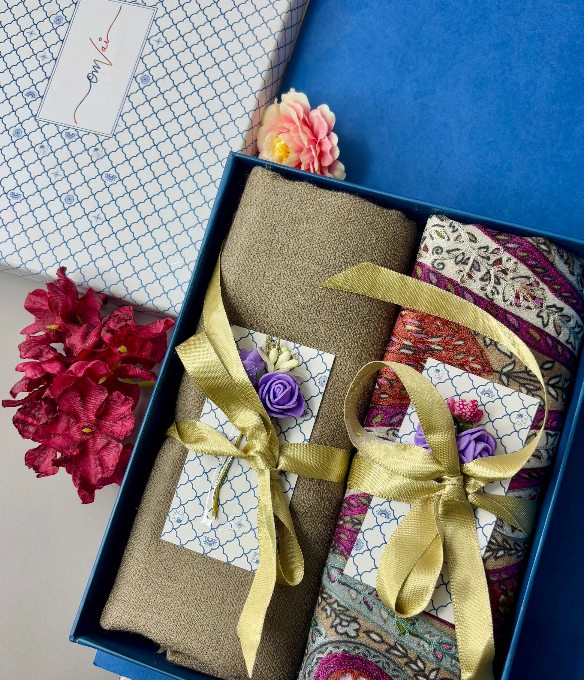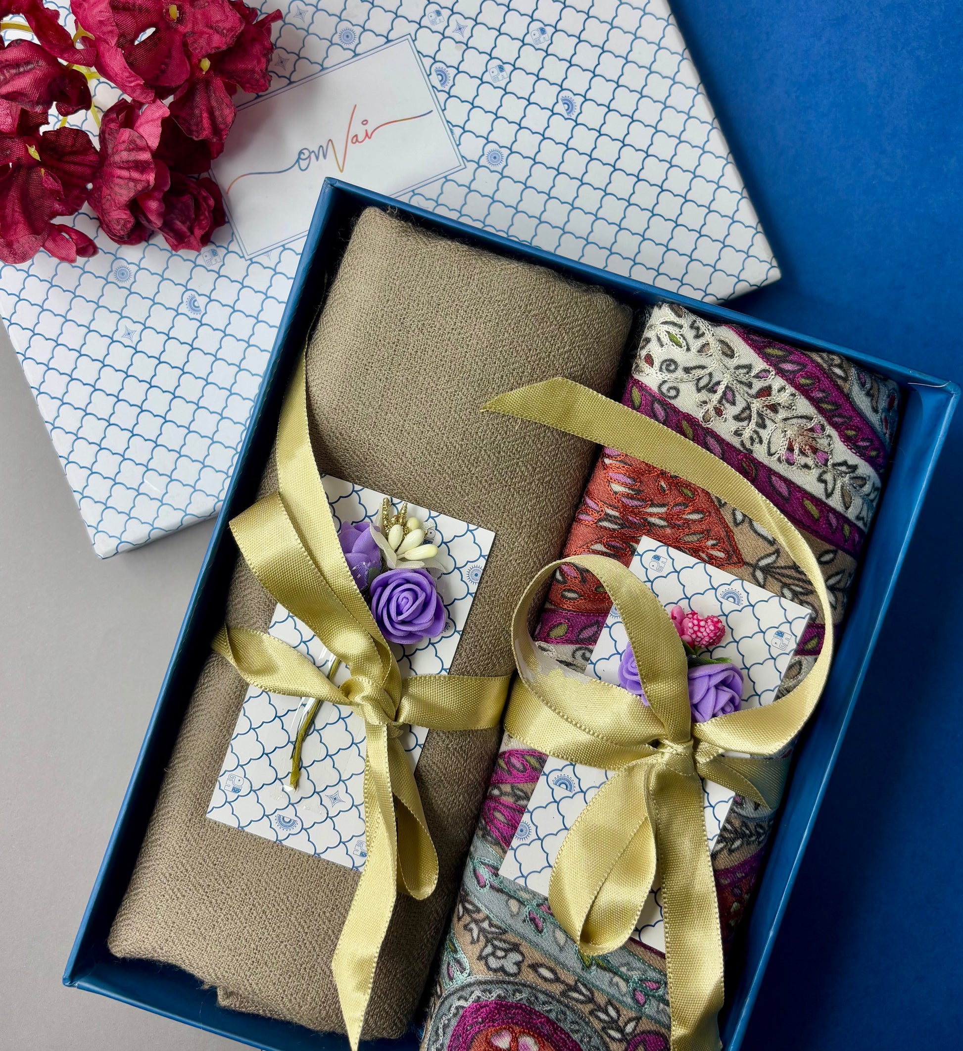 OMVAI Pashmina Combo Gift Set in Pure Cashmere wool - Clay Kalamkari Kani with Embroidery and solid (Set of 2 - For HIM and for HER)