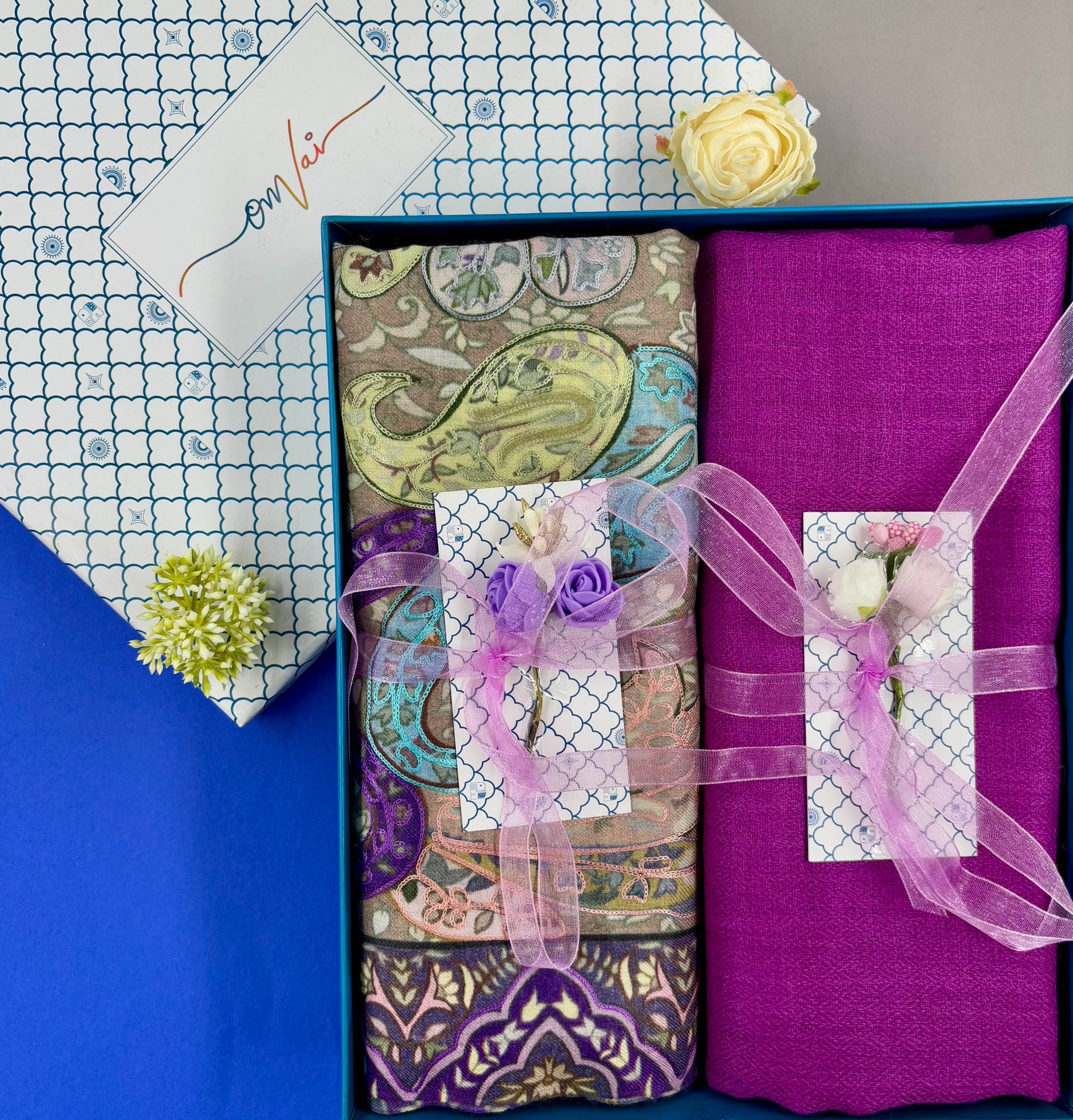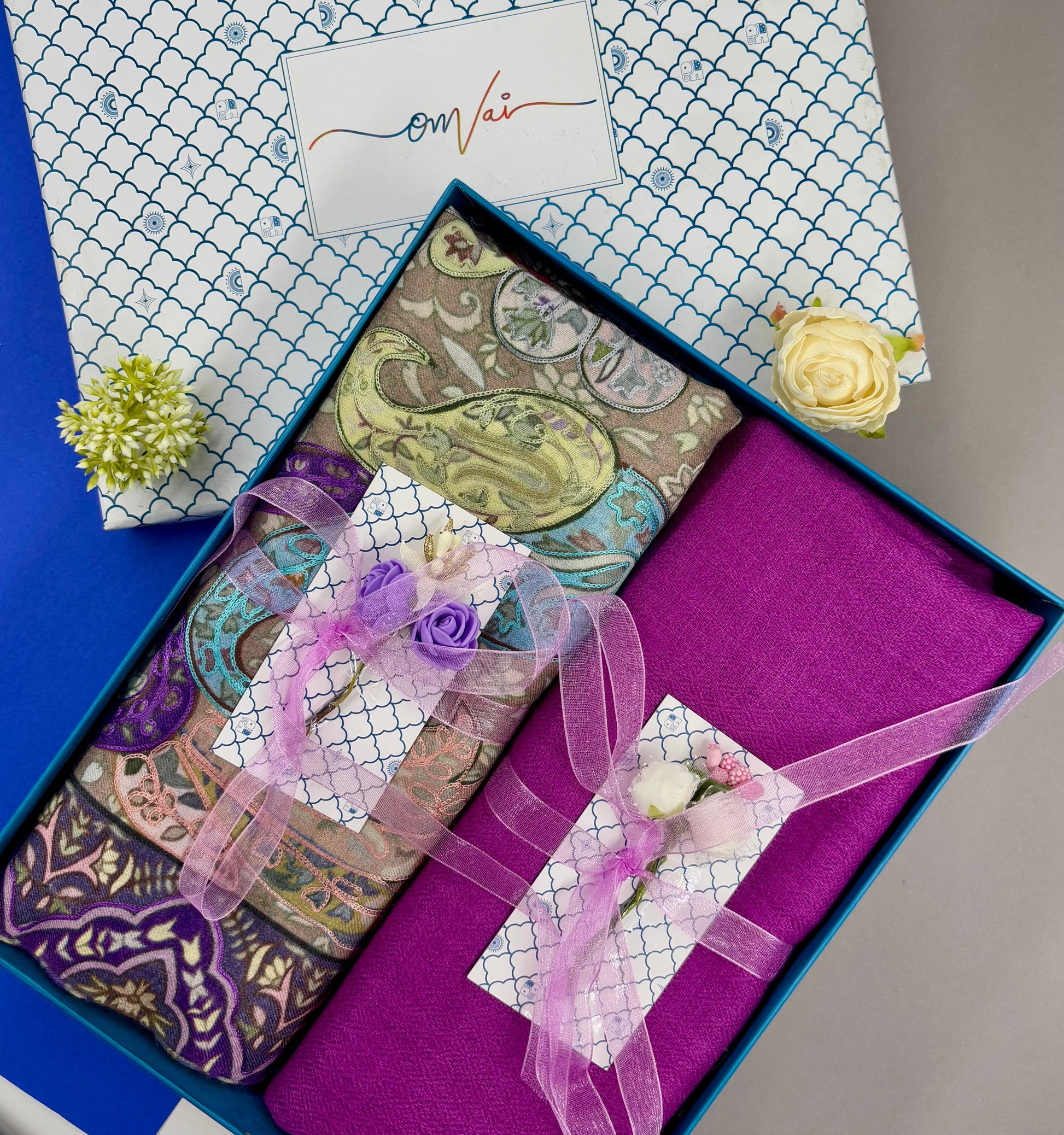 OMVAI Pashmina Combo Gift Set in Pure Cashmere wool - Purple Kalamkari Kani with Embroidery and solid (Set of 2 - For HIM and for HER)