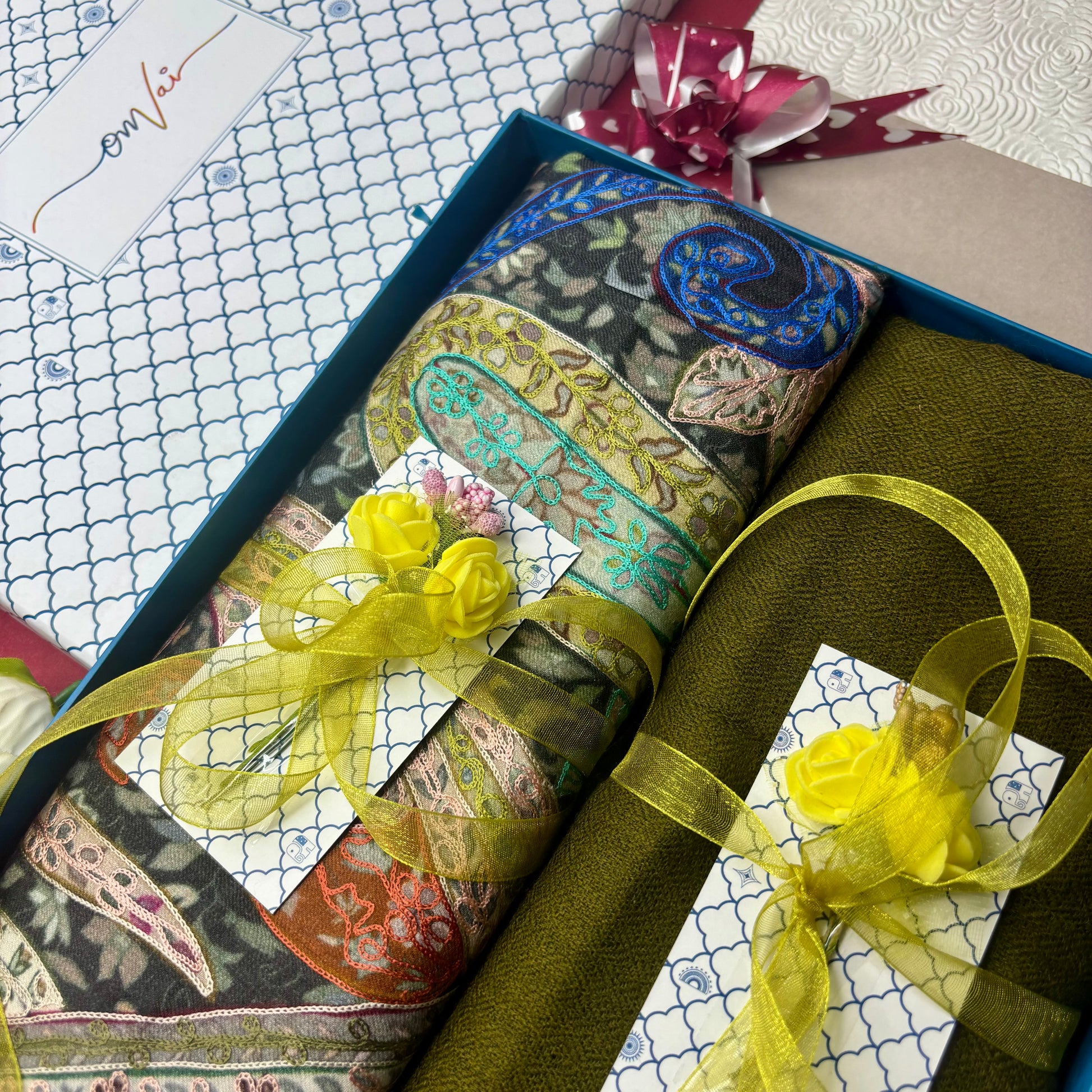 OMVAI Pashmina Combo Gift Set in Pure Cashmere wool - Sage Green Kalamkari Kani with Embroidery and solid (Set of 2 - For HIM and for HER)