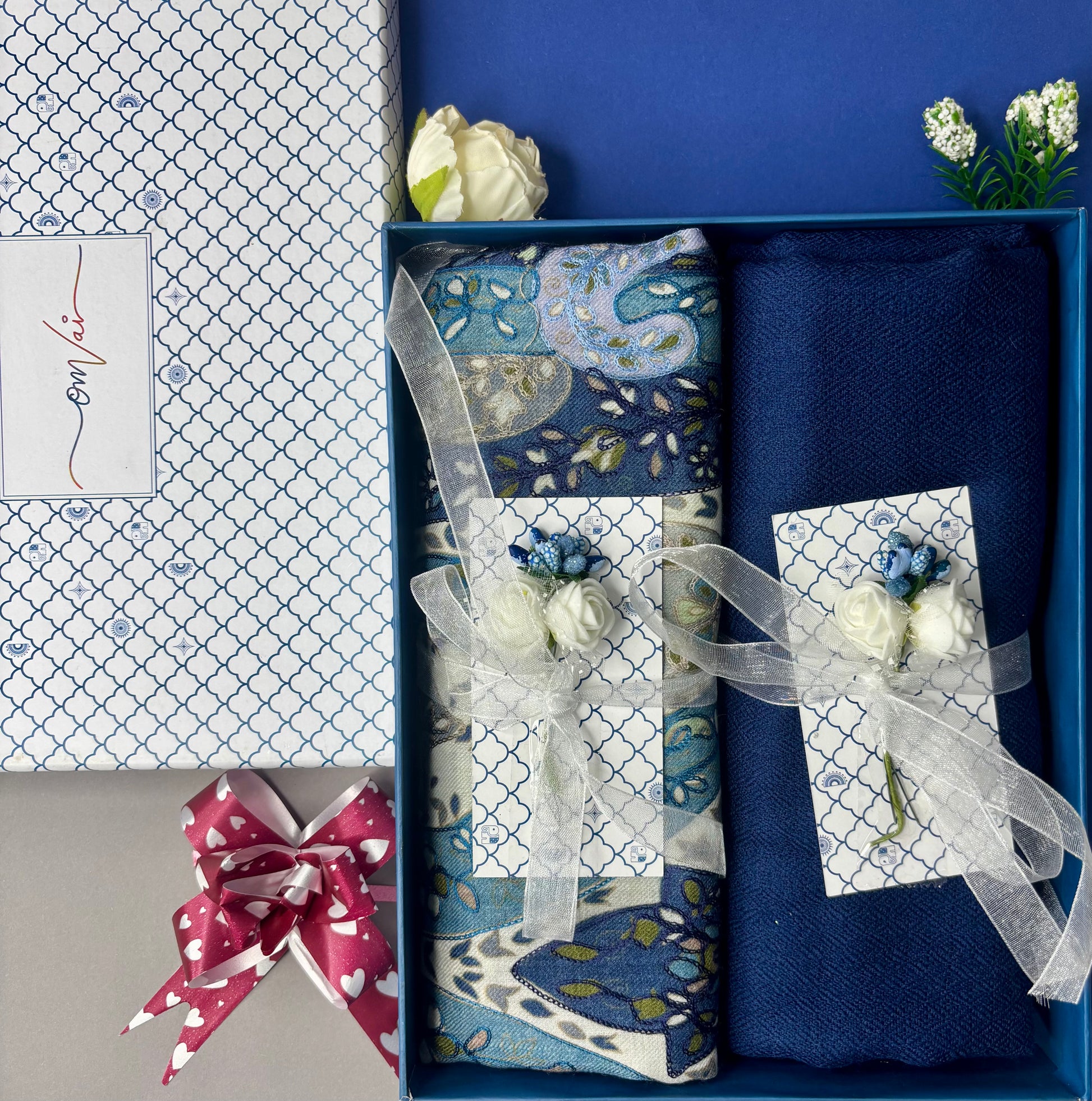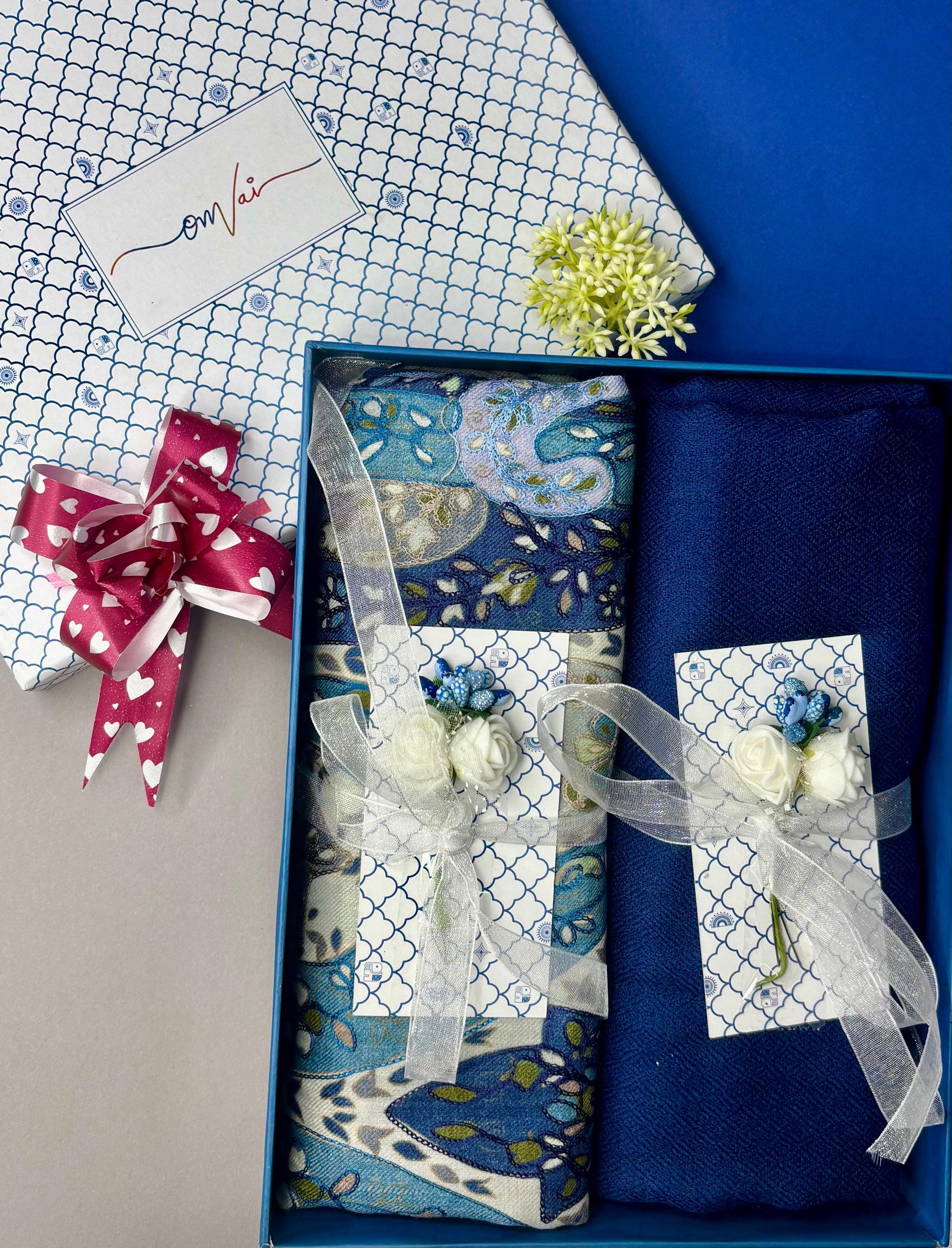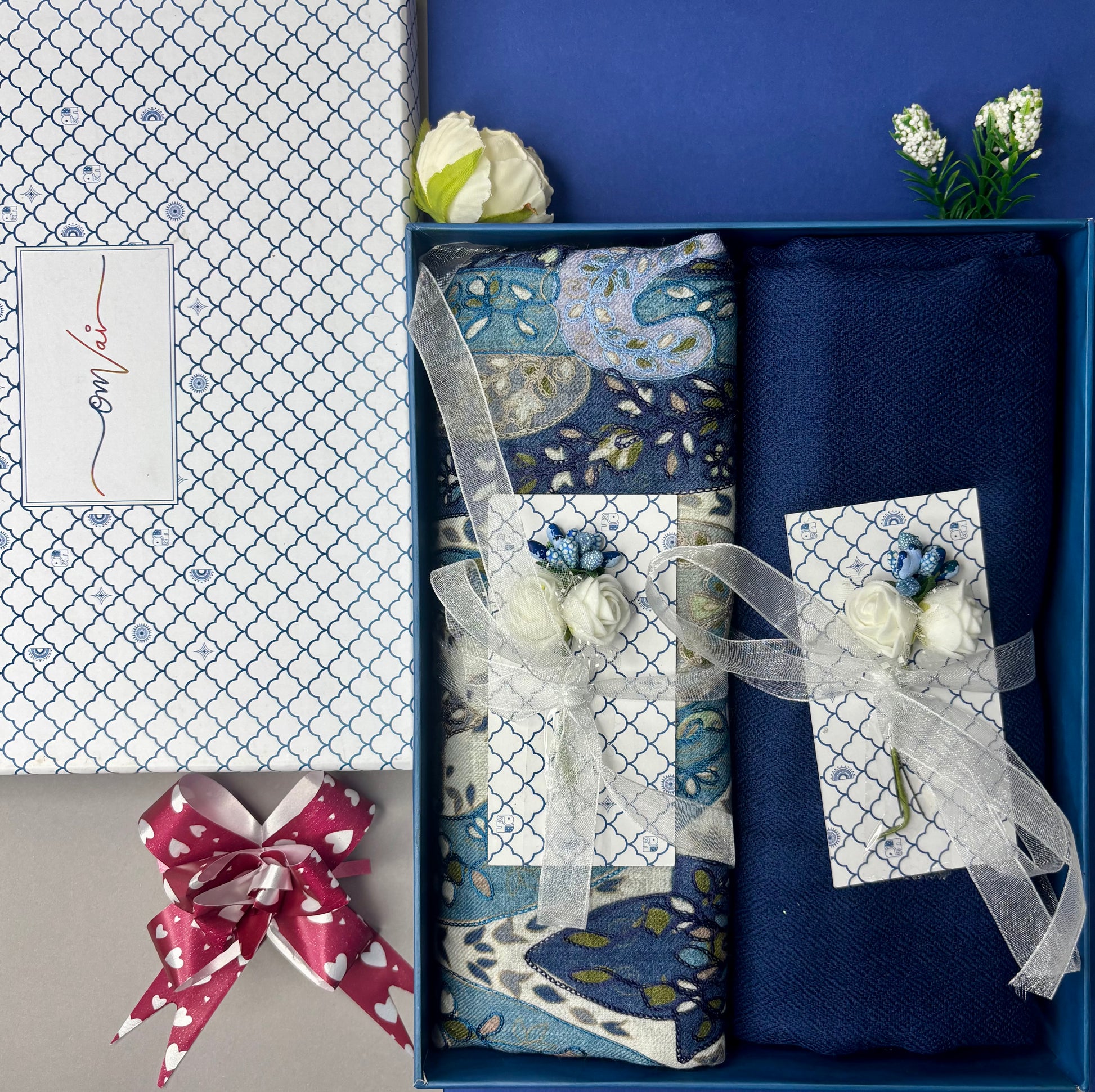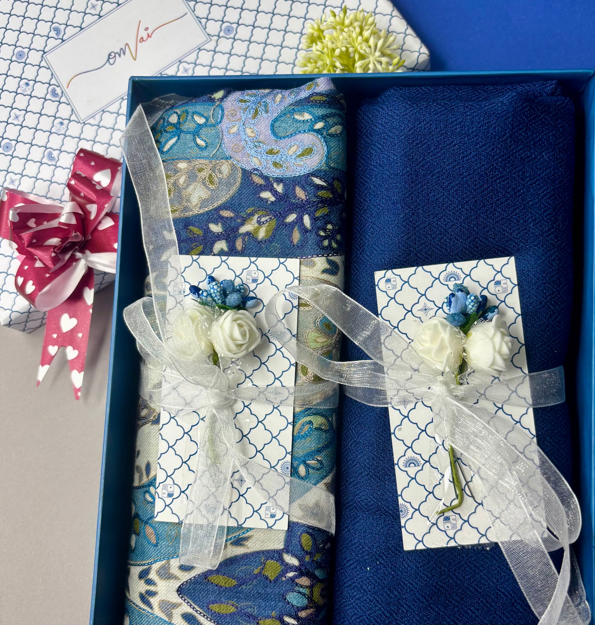 OMVAI Pashmina Combo Gift Set in Pure Cashmere wool - Steel Blue Kalamkari Kani with Embroidery and solid (Set of 2 - For HIM and for HER)