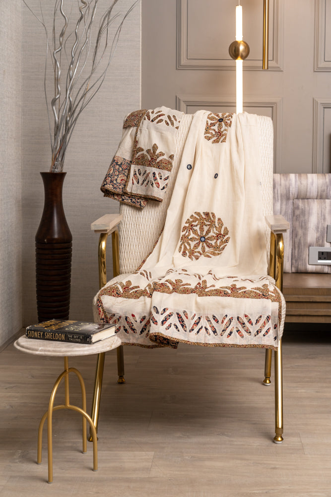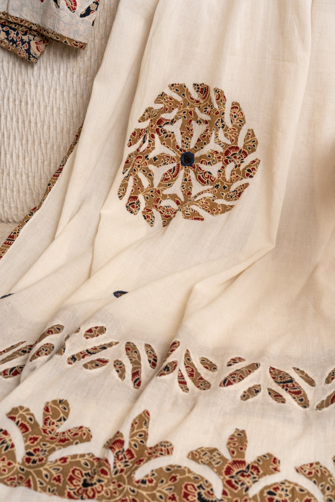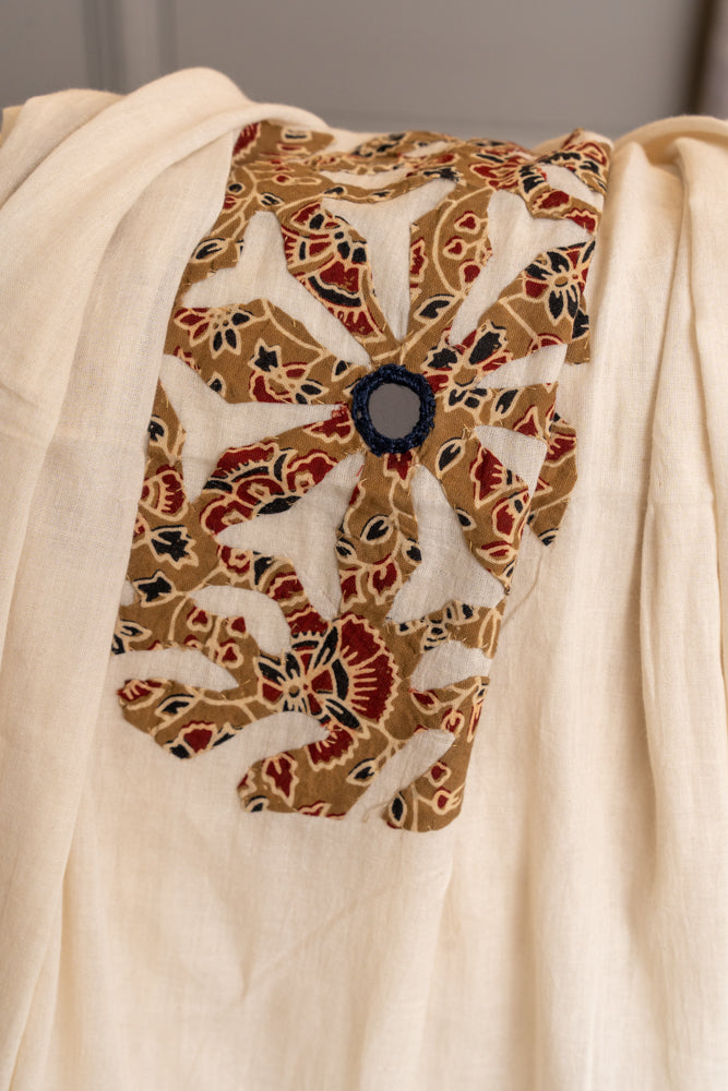 The beauty of this dupatta is not just restricted to the design but also reflects in its quality. Made up of pure cotton, with extensive applique in hand block printed fabrics and mirror work, it will last longer than any other type of fabric. The blue color border with multi color applique patches adds to its charm and helps set you apart from the rest. The mirror work on the dupatta also looks prettier and super chic.