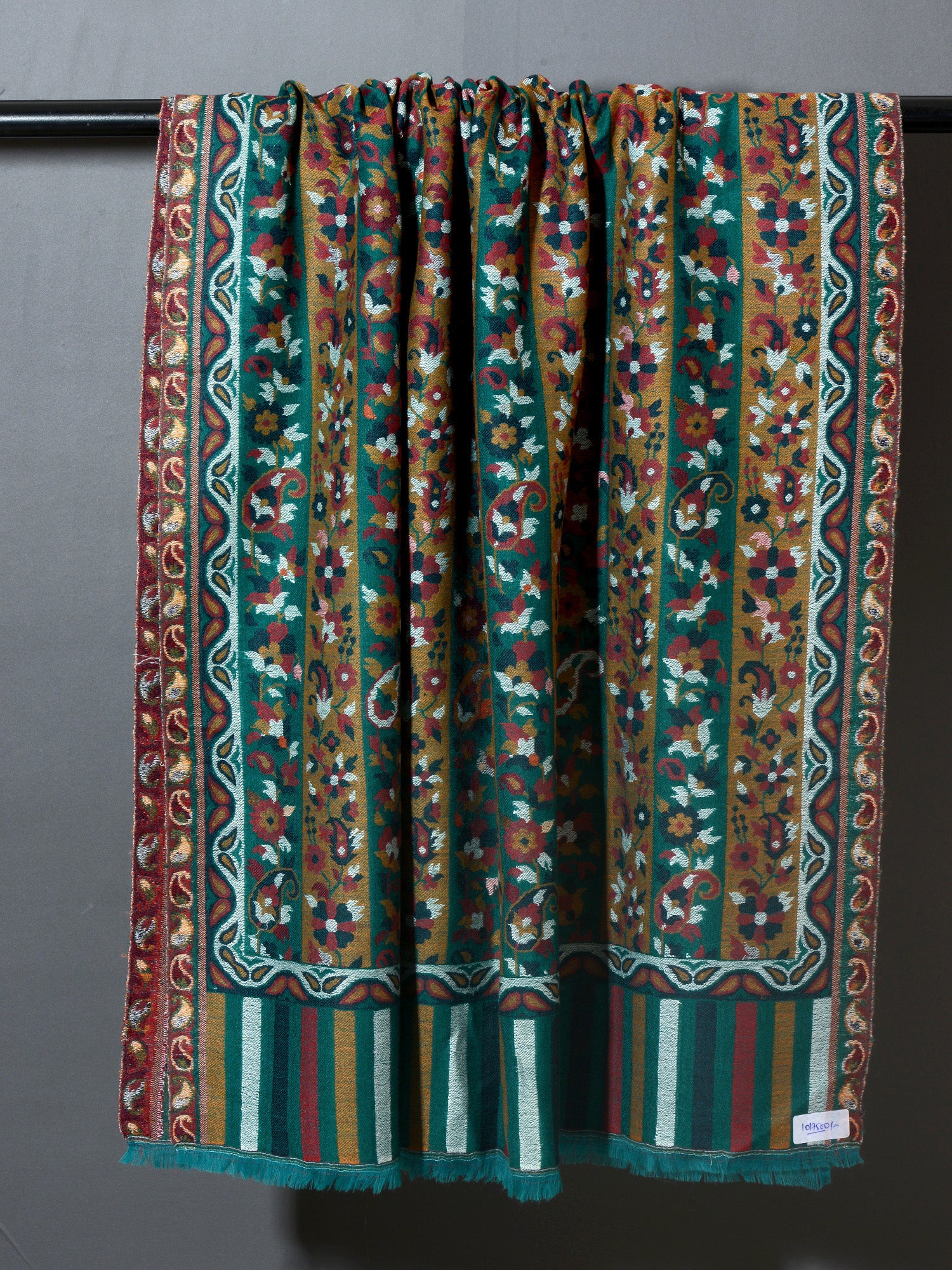 The traditional name for this variety of shawls is" Kani" and is very famous from the lands of Kashmir. Kani is generally an array of beautiful patterns woven using bright colors with a multi colored striped edges. This particular shawl is made in wool, but is not hand woven. It is machine woven to give the Kani look. The original Kani is much more lighter, softer to feel and more luxurious.