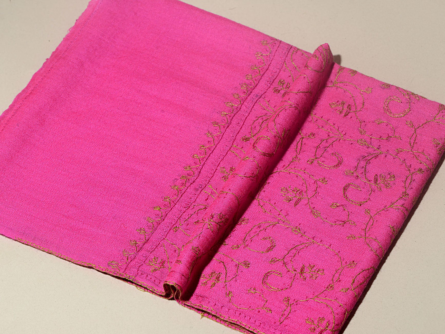 ZAIRA means beautiful flower. Zaira is an elegant pink embroidered shawl, both for men and women. It is made with an intricate embroidery on the border and the traditional motif using silk threads. The intricate jaal look in the border with floral motifs makes the pashmina look divine and mesmerizing